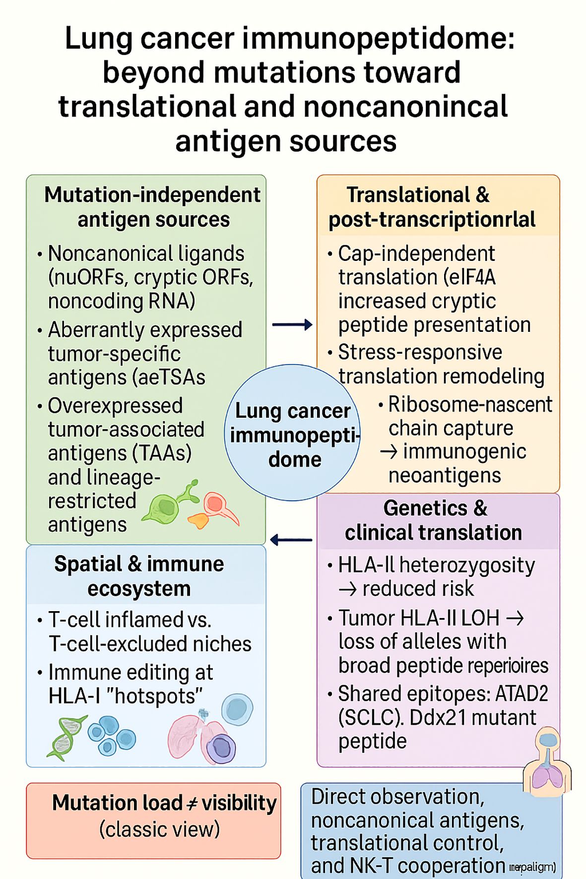 Figure 8. The lung cancer immunopeptidome extends beyond mutational burden, integrating noncanonical and lineage-restricted antigens, translational remodeling, spatial immune niches, and HLA variation. These context-dependent layers explain why mutation load does not equate to antigen visibility and highlight new therapeutic paradigms centered on direct ligand observation, noncanonical antigen discovery, translation-aware modulation, and NK–T cell cooperation.