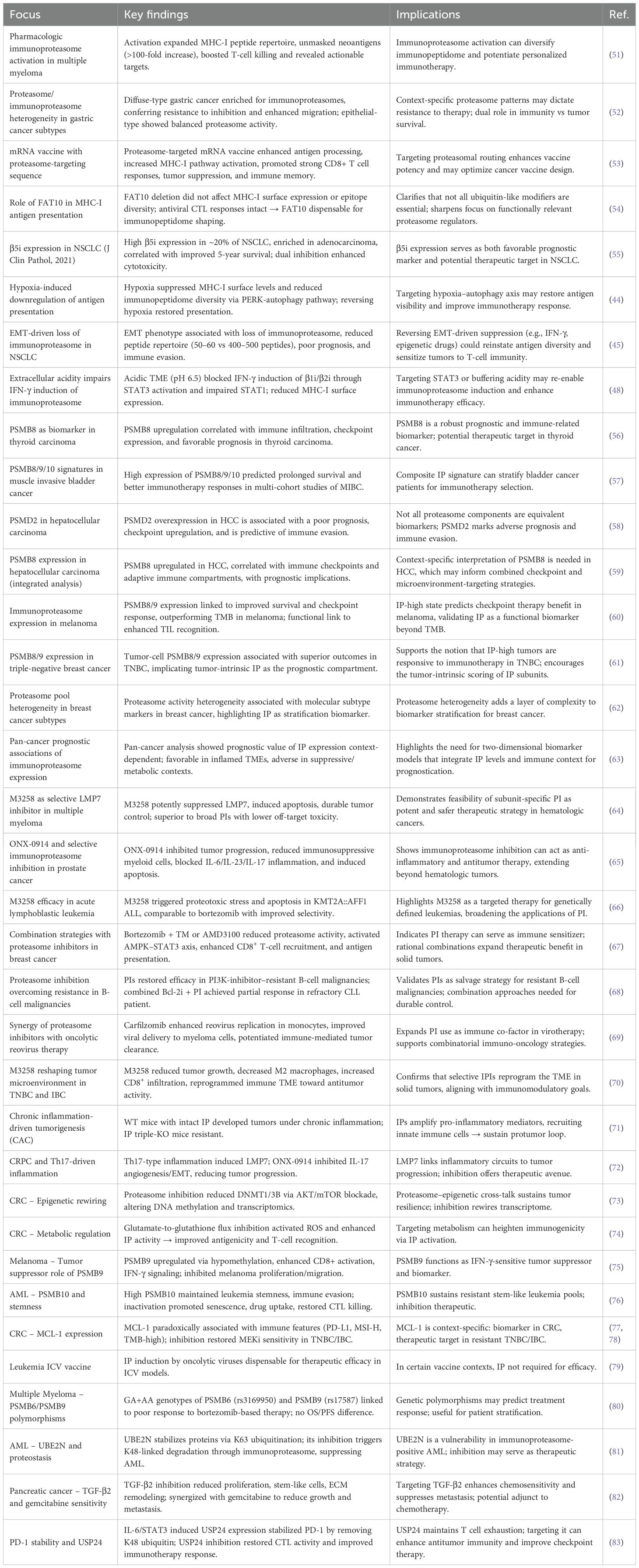 The IP illustrates a paradox in cancer biology: depending on the inflammatory and tissue context, it can either promote tumorigenesis or support immune-mediated clearance. This duality reflects the capacity of the IP to integrate signals from cytokines, metabolic stress, and epigenetic states, thereby shaping both the tumor cell proteome and the tumor–immune dialogue. On the pro-tumorigenic side, IP activity can exacerbate chronic inflammation, skew cytokine production, and sustain immune environments that favor cancer development. In colitis-associated carcinogenesis (CAC) models, wild-type mice with intact IPs developed tumors as a result of chronic inflammation, yet LMP2/MECL-1/LMP7 triple-deficient mice remained resistant (71). Mechanistically, IPs amplified pro-inflammatory mediators and promoted recruitment of innate immune cells, thereby fueling a protumorigenic loop. Likewise, in castration-resistant prostate cancer (CRPC), Th17-type tumor-induced inflammation promotes LMP7 expression; pharmacological inhibition of LMP7 by ONX-0914 suppresses IL-17-mediated angiogenesis and EMT, thereby suppressing tumor growth (72). These studies demonstrate that IP expression, particularly under chronic inflammatory cues, can sustain protumor circuits. The remaining protumor regulatory levels include genetic polymorphisms, regulation of proteostasis, and TGF-β signaling. In myeloma, shared SNPs in PSMB6 and PSMB9 were associated with a decreased response to bortezomib therapy, without affecting survival, demonstrating how germline variation can influence IP-related therapeutic effects (80). In acute myeloid leukemia, the ubiquitin-conjugating enzyme E2 N (UBE2N) stabilizes K63-linked chain proteins to safeguard them against immunoproteasome-dependent degradation; inhibition of this enzyme preferentially down-regulates immunoproteasome-positive acute myeloid leukemia (AML) and demonstrates the capacity of the ubiquitin–IP axis in maintaining leukemic proteostasis (81). Likewise, in pancreatic cancer, transforming growth factor-beta 2 (TGF-β2) plays a crucial role in maintaining stemness, chemoresistance, and metastasis. Antisense inhibition of TGF-β2 was found to be synergistic with gemcitabine in preventing tumor growth and dissemination, illustrating how immunoproteasome-associated signaling converges with growth factor networks (82).