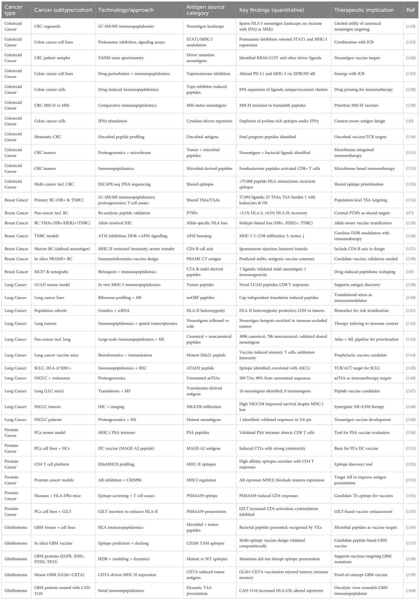 Table 2. Summary of cancer-type–specific immunopeptidomes across colorectal, breast, liver, lung, brain, and prostate tumors, highlighting cohorts, technologies, and therapeutic implications.