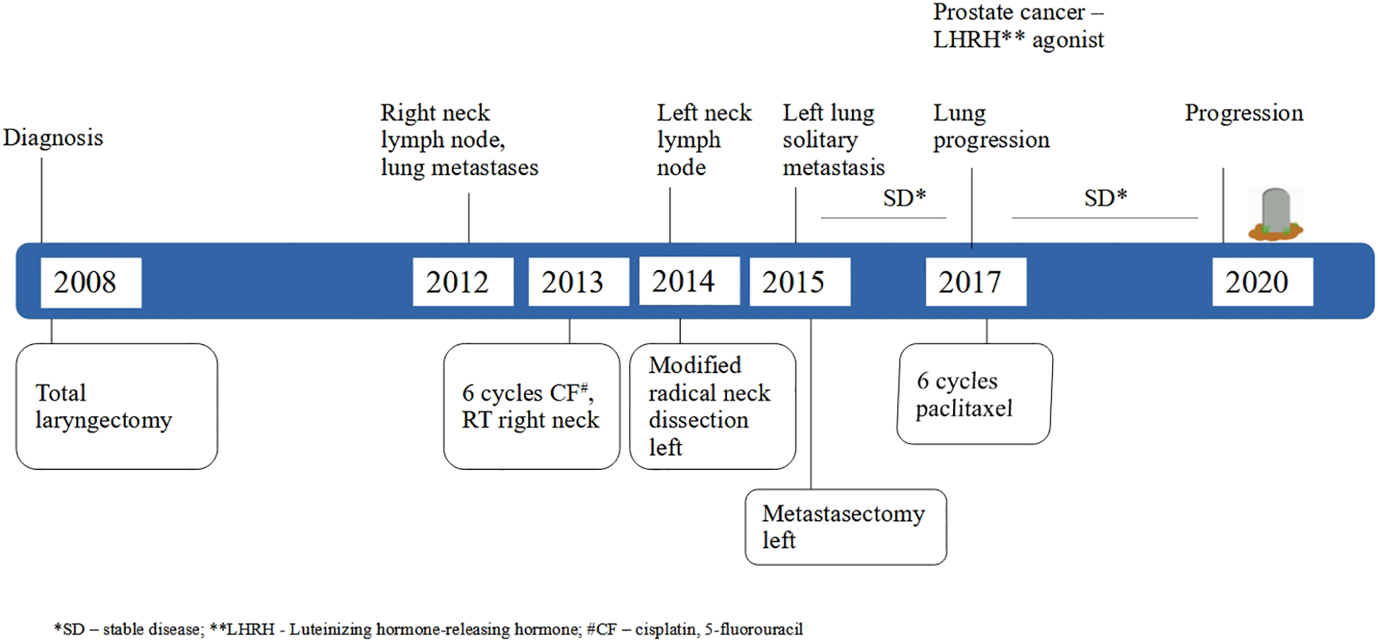 A 46-year-old patient, a long-term smoker, presented to the ENT clinic in January 2008 with a two months of dysphonia. Laryngoscopic examination and neck computed tomography (CT) revealed a glottic tumor extending into the subglottic region, without evidence of cervical lymphadenopathy. The tumor was staged as cT2cN0cM0 (Figure 1). His medical history was notable only for previous tuberculosis. Total laryngectomy was performed. Histological analysis confirmed SCC, pT2NxMx, without adverse pathological features. The patient remained in regular follow-up without signs of recurrence until November 2012, when a palpable, painless mass was detected in the right level II neck region. Fluorine-18 fluorodeoxyglucose positron emission tomography/computed tomography (18F-FDG PET/CT) confirmed a right cervical mass measuring 2.3 x 2.2 cm, along with a solitary 1.2 cm lesion in the left upper lung lobe and a suspicious 1.5 cm nodule in the right upper lung lobe. Cytological examination of the cervical lymph node revealed SCC. From a differential diagnostic perspective, in addition to metastases from laryngeal carcinoma, a second primary lung tumor with metastasis to the cervical lymph nodes was also considered. Although metastases from a primary lung tumor are more commonly found in the supraclavicular region than in level II cervical nodes, this possibility was taken into account. Bronchoscopy did not reveal any malignant cells, and a transthoracic biopsy of the pulmonary lesion was not performed. From March to August 2013, the patient received 6 cycles of chemotherapy consisting of cisplatin 100 mg/m2 and 5-fluorouracil 1000 mg/m2 every 3 weeks. Follow-up CT imaging of the neck and chest showed stable pulmonary lesions but further enlargement of the cervical lymph node, without new metastases. In December 2013, palliative radiotherapy to the right neck was administered using 6 MV photon beams delivered by a Primus Plus linear accelerator (Siemens, Germany), equipped with an 82-leaf multileaf collimator (MLC). Total dose of 30 Gy was given in 10 fractions over two weeks. In January 2014, follow-up imaging showed significant regression of the right cervical lymph node, now 8 x 8 mm, while the right pulmonary nodule remained unchanged and the left pulmonary nodule was no longer visible. In March 2014, PET/CT revealed a solitary suspicious lymph node in the left level II neck region, without other signs of active disease. Cytology confirmed SCC. In May 2014, a modified radical neck dissection was performed, preserving the XI cranial nerve and internal jugular vein. Of 22 resected lymph nodes, one was positive for malignancy (Figure 2A). In October 2014, CT imaging once again identified a 14 x 12 mm nodule in the left upper lung lobe and an 8 x 8 mm necrotic lymph node in the left level II neck. PET/CT showed the pulmonary nodule as the sole site of active disease. Given the patient’s good general condition (Eastern Cooperative Oncology Group (ECOG) status 0), a pulmonary metastasectomy was performed in January 2015. Histopathological examination revealed a 1 cm tumor nodule composed of cells that were strongly positive for CK5/6 and negative for TTF-1 on immunohistochemistry. The tumor was located at one margin of the resection (Figure 2B). Although it is challenging to histologically distinguish a metastatic laryngeal SCC in the lung from a primary pulmonary SCC, as both share similar morphological features, the clinical history, radiologic findings, and immunohistochemistry in this case supported the conclusion that the pulmonary lesions represented metastases from the laryngeal carcinoma. No clinical or radiological evidence of recurrence was observed until February 2017, when PET/CT detected progression in the left lung. An incidental focal radiotracer uptake in the prostate prompted biopsy, confirming prostate adenocarcinoma with a Gleason score 4 + 4 = 8. At diagnosis, the prostate-specific antigen (PSA) level was 6.78 μg/l. Androgen deprivation therapy with luteinizing hormone-releasing hormone (LHRH) agonists was initiated in April 2017. According to the available literature, there is no known etiological or molecular link between laryngeal SCC and prostate adenocarcinoma. Thus, the simultaneous occurrence of these two tumor types in this patient likely reflected the independent development of two distinct malignancies with different risk factors. Due to progression of pulmonary metastases, the patient received 6 cycles of paclitaxel 175 mg/2 every 3 weeks from May to September 2017. Imaging showed stable disease with no significant progression. Prostate cancer remained well-controlled with PSA nadir < 0.01μg/l by January 2018. The patient tolerated the treatment well, experiencing no adverse effects other than occasional fatigue and showed good adherence to the therapy schedule. No dose modifications of chemotherapy were required, likely due to the relatively short duration of therapy, which was never longer than six consecutive months and included treatment-free intervals. The patient maintained a good quality of life until early 2018 and remained generally optimistic, although some concern arose with disease relapse. Despite radiological stability of the lung metastases and consistently low PSA levels, the patient’s general condition gradually declined starting in early 2018. Regular follow-up was continued with CT imaging, laboratory tests, and clinical examinations every four months. In November 2020, CT imaging revealed widespread metastatic disease, including new lesions in the lung, liver, cervical, mediastinal and retroperitoneal lymph nodes as well as osteolytic bone metastases. PSA had risen to 6.70 μg/l and the patient’s performance status deteriorated to ECOG 4. He died on December 14, 2020, eight years following the diagnosis of metastatic laryngeal disease.
