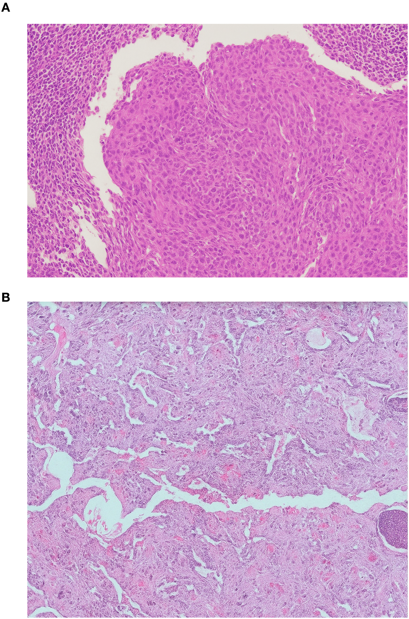 Histopathological features of metastatic laryngeal squamous cell carcinoma. (A) Cervical lymph node metastasis showing nests of atypical squamous epithelial cells with keratinization and intercellular bridges. (B) Lung metastasis displaying similar morphological characteristics confirming metastatic squamous cell carcinoma (hematoxylin and eosin stain, ×200).