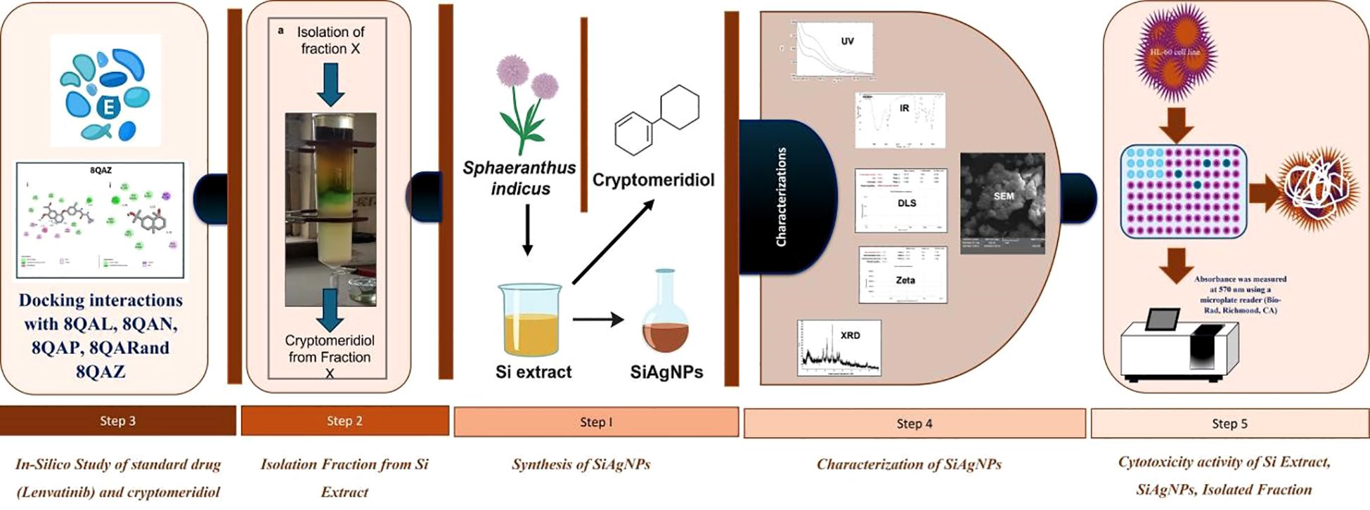 Despite extensive studies on the pharmacological properties of Si, limited research has focused on its molecular mechanisms and nanotechnology-based applications for HCC. Furthermore, there is a lack of comprehensive studies integrating phytochemical analysis, nanoparticle synthesis, and molecular docking to elucidate the mechanistic interaction between Si-derived molecules and HCC-associated protein targets. This study addresses these gaps by isolating cryptomeridiol, synthesizing Si-mediated silver nanoparticles (SiAgNPs), and evaluating their cytotoxic and apoptotic potential against HepG2 cells. Therefore, the current investigation aims to identify the potential cytotoxicity of ethanol extracts and their derived fractions of Si extract on HCC using HepG2 cells. (SiAgNPs) Although Si is an effective medicinal plant, its cytotoxicity against lung, ovary, prostate, neuroblastoma, breast, and colon cancers and the responsiveness of cell lines to the plant extract have not been studied (Figure 1). The current study aims to determine the cytotoxic and apoptotic potential of the alcoholic extract and isolated components of Si on HCC (HepG2).