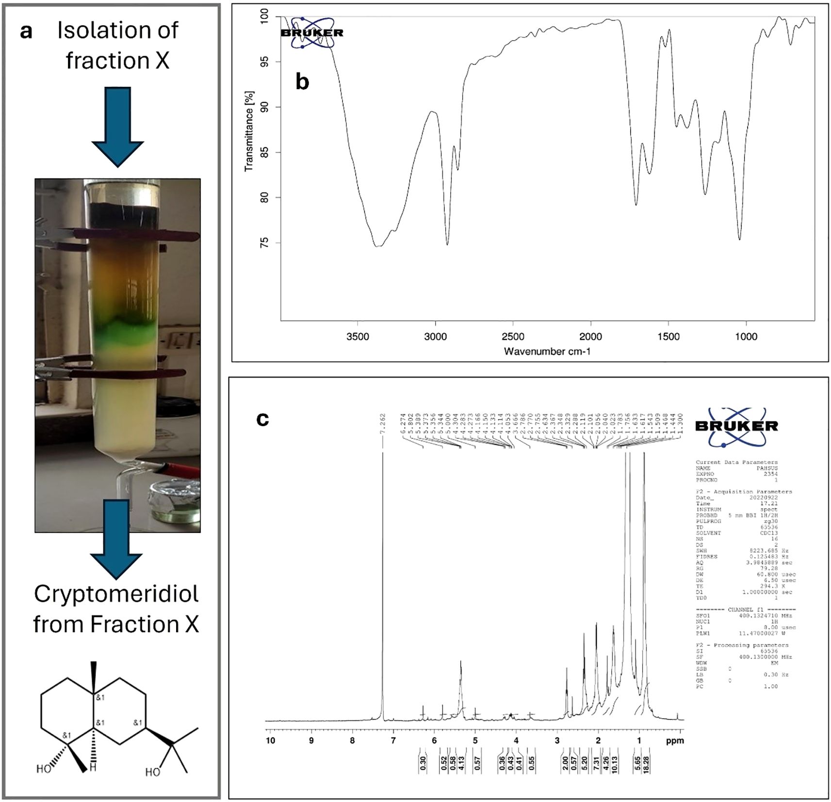 Figure 2. Isolation and structural characterization of cryptomeridiol. (a) Column chromatography of the chloroform:benzene (7:3) eluent produced cryptomeridiol as a green crystalline powder. (b) IR spectrum of cryptomeridiol showing characteristic absorption bands confirming hydroxyl and other functional groups. Broad bands at 3397.02, 3346.64, and 3302.00 cm−1 correspond to O–H stretching vibrations, indicating strong hydrogen bonding among hydroxyl groups. (c) ^1H NMR spectrum (400 MHz, CDCl3) of cryptomeridiol displaying characteristic resonances consistent with a sesquiterpene diol structure. High-field signals at δ 0.30–1.80 ppm indicate methyl and methylene protons of the cyclohexane framework, with distinct tertiary methyl singlets (δ 0.41–0.58 ppm). Signals in δ 2.0–2.8 ppm correspond to allylic methylene/methine protons, while downfield resonances (δ 3.6–4.3 ppm) indicate oxygenated methine protons. Olefinic signals appear at δ 5.00, 5.34–5.39, and 5.80 ppm, with additional weaker resonances at δ 6.27 and 7.26 ppm. A broad deshielded signal at δ ~10.1 ppm corresponds to hydrogen-bonded hydroxyl protons. Collectively, the spectral data confirm the identity of the isolated compound as cryptomeridiol, a bicyclic sesquiterpene diol.
