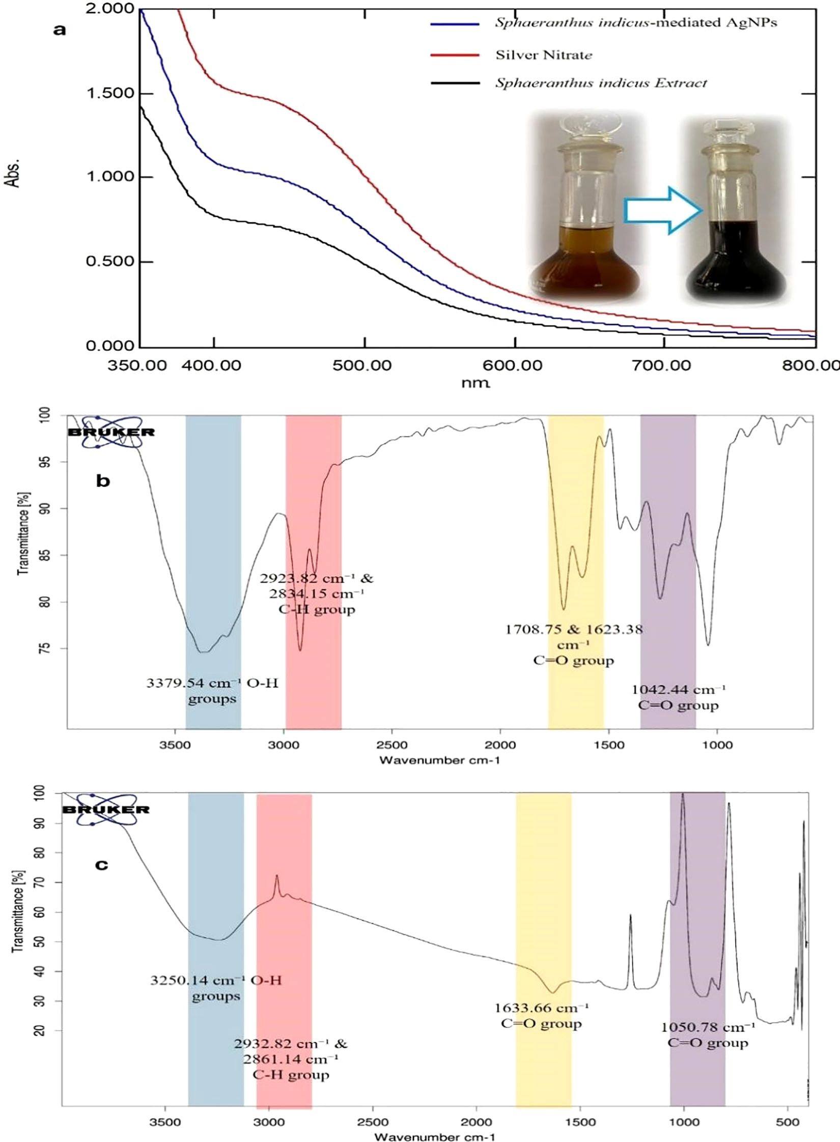 Figure 3. UV–Visible and FTIR analysis of S.i. ext., silver nitrate, and synthesized silver nanoparticles (SiAgNPs). (a) UV–Visible spectra showing λmax at 440 nm for the extract, 443 nm for AgNO3, and a plasmon resonance peak at 437 nm for SiAgNPs, with a visible color change from yellow to brown confirming nanoparticle formation. (b) FTIR spectrum of the extract showing O–H, C–H, C=O, C=C, and C–O functional groups. (c) FTIR spectrum of SiAgNPs showing similar bands with reduced intensity, indicating involvement of phytochemicals in nanoparticle synthesis and stabilization.
