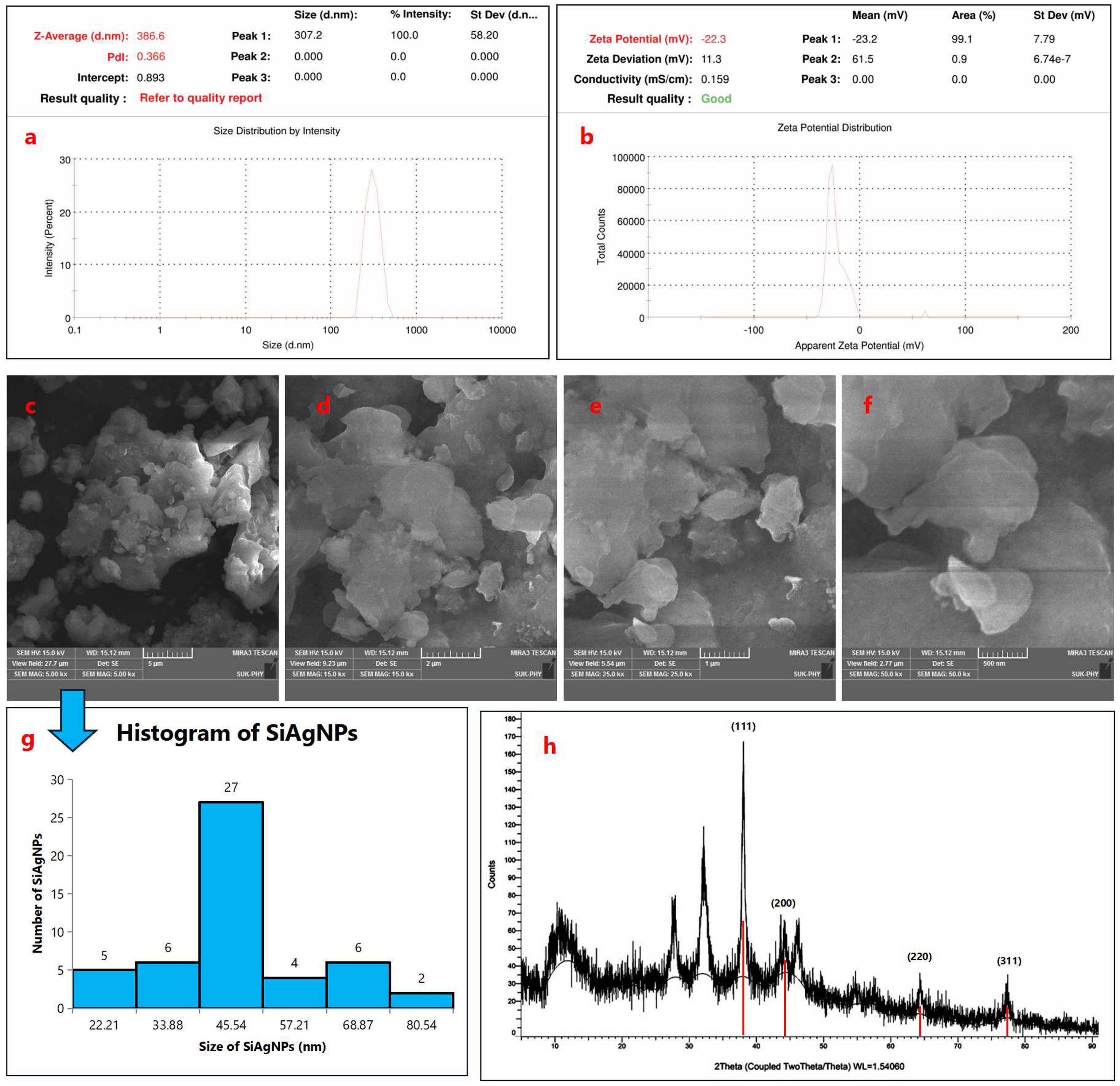 Figure 4. Dynamic light scattering (DLS) characterization of Si–mediated silver nanoparticles (AgNPs). (a) Particle size distribution showing a Z-average size of 386.6 nm with a polydispersity index (PDI) of 0.366, indicating a fairly uniform particle distribution with limited aggregation. (b) Zeta potential analysis depicting a surface charge of –22.3 mV and a conductivity of 0.159 mS/cm, confirming the formation of stable and well-dispersed AgNPs in the aqueous medium; Morphological and structural characterization of silver nanoparticles (SiAgNPs). (c–f) SEM micrographs showing predominantly spherical nanoparticles with some agglomerates. (g) Particle size distribution (ImageJ analysis) indicating an average size of 38.35 ± 16.42 nm, confirming uniformity with minor aggregation. FESEM further supported the spherical morphology; (h) XRD diffractogram of SiAgNPs showing distinct peaks at 11.10°, 27.89°, 32.51°, 38.09°, 44.47°, 64.34°, and 77.50° (2θ). Characteristic reflections at 38.09°, 44.47°, 64.34°, and 77.50° correspond to the (111), (200), (220), and (311) planes of fcc silver (JCPDS card No. 04-0783). The dominance of the (111) plane indicates preferential orientation and polycrystalline nature. Crystallite size calculated by the Debye–Scherrer equation was ~16.8 nm, consistent with nanoscale dimensions.
