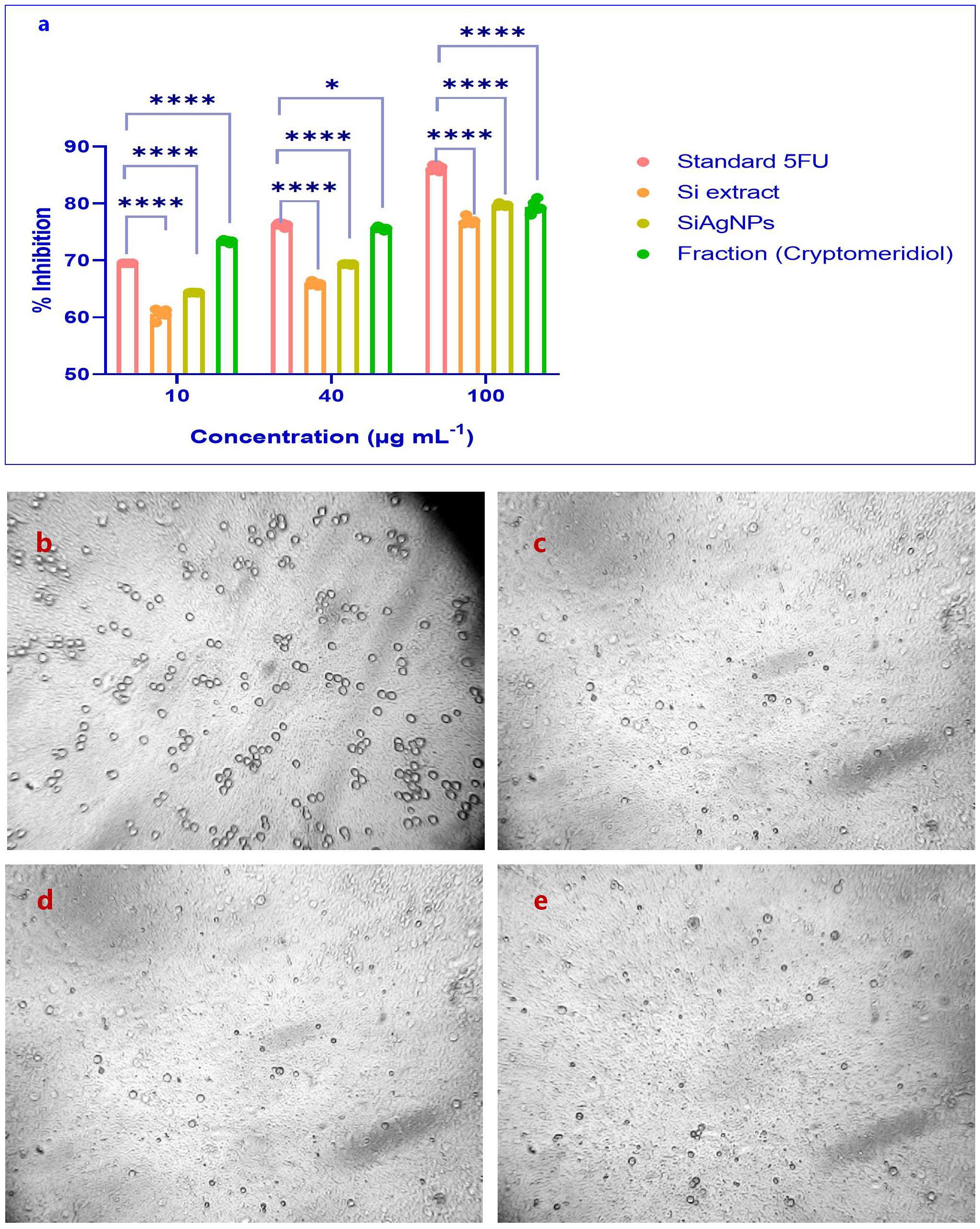 Figure 5. (a) Proliferation inhibition of HCC (HepG2) and normal liver cells by S.i. ext., SiAgNPs, and isolated fraction (cryptomeridiol). MTT/CCK-8 assays were used to evaluate dose- and time-dependent cytotoxic effects over 0–72 h. The treatments showed significant growth inhibition in HepG2 cells, with IC50 values of 43.16 µg/mL (5-FU), 44.93 µg/mL (Si extract), 42.16 µg/mL (SiAgNPs), and 43.87 µg/mL (cryptomeridiol). Maximal inhibition of >75% was observed, indicating apoptosis or cell cycle arrest as potential mechanisms. Cell viability of Control (b) Standard (c) Si-AgNPs (d) and cryptomeridiol (e). * indicates p<0.05 (significant), and **** indicates p<0.0001 (extremely significant).