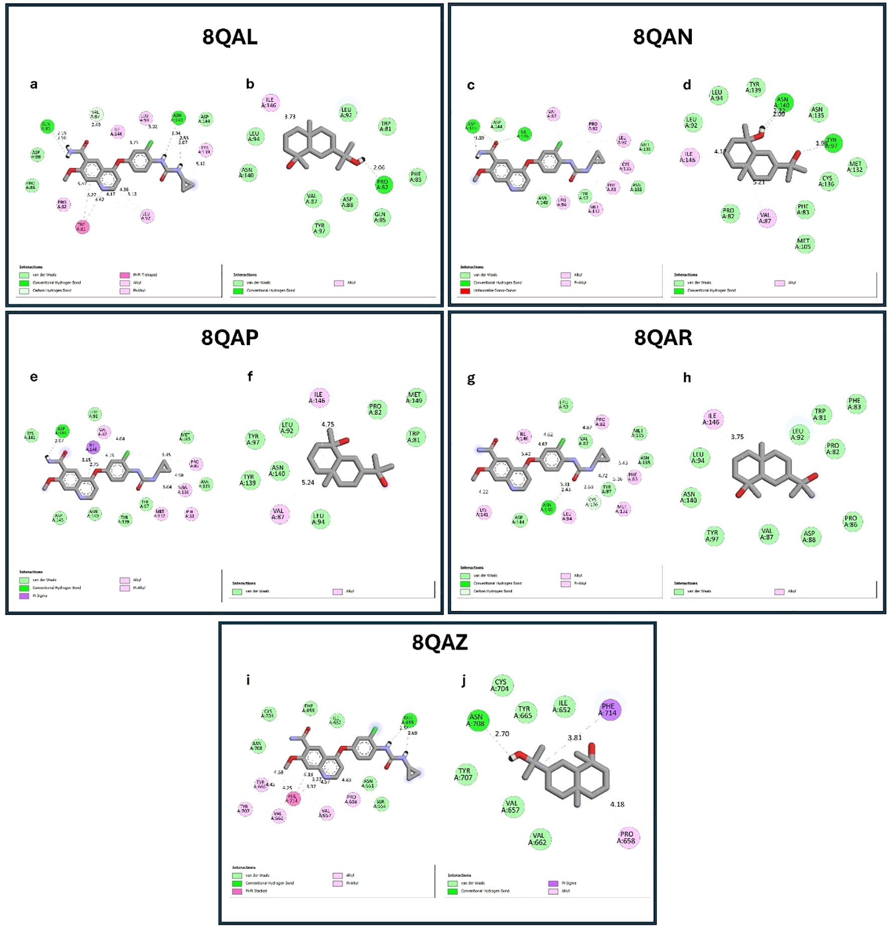 Figure 6. Molecular docking interactions of standard drug (Lenvatinib) and cryptomeridiol with BRD4 target proteins. (a, b) Docking interactions with 8QAL; (c, d) 8QAN; (e, f) 8QAP; (g, h) 8QAR; (i, j) 8QAZ. In each pair, the left panel (a, c, e, g, i) represents the standard drug Lenvatinib, while the right panel (b, d, f, h, j) shows cryptomeridiol. Cryptomeridiol exhibited strong binding affinities (–7.1 to –8.1 kcal/mol) comparable to Lenvatinib, engaging in van der Waals, hydrogen bonding, and hydrophobic interactions with key residues of BRD4 proteins, highlighting its potential as an anti-hepatic cancer agent.
