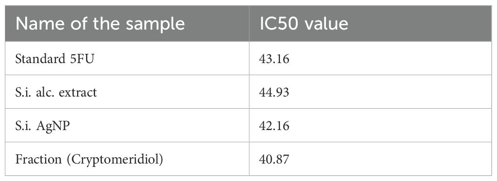 Table 1. IC50 values of Standard 5-Fluorouracil (5-FU), Si alcoholic extract, biosynthesized SiAgNPs, and cryptomeridiol fraction against HepG2 cells.