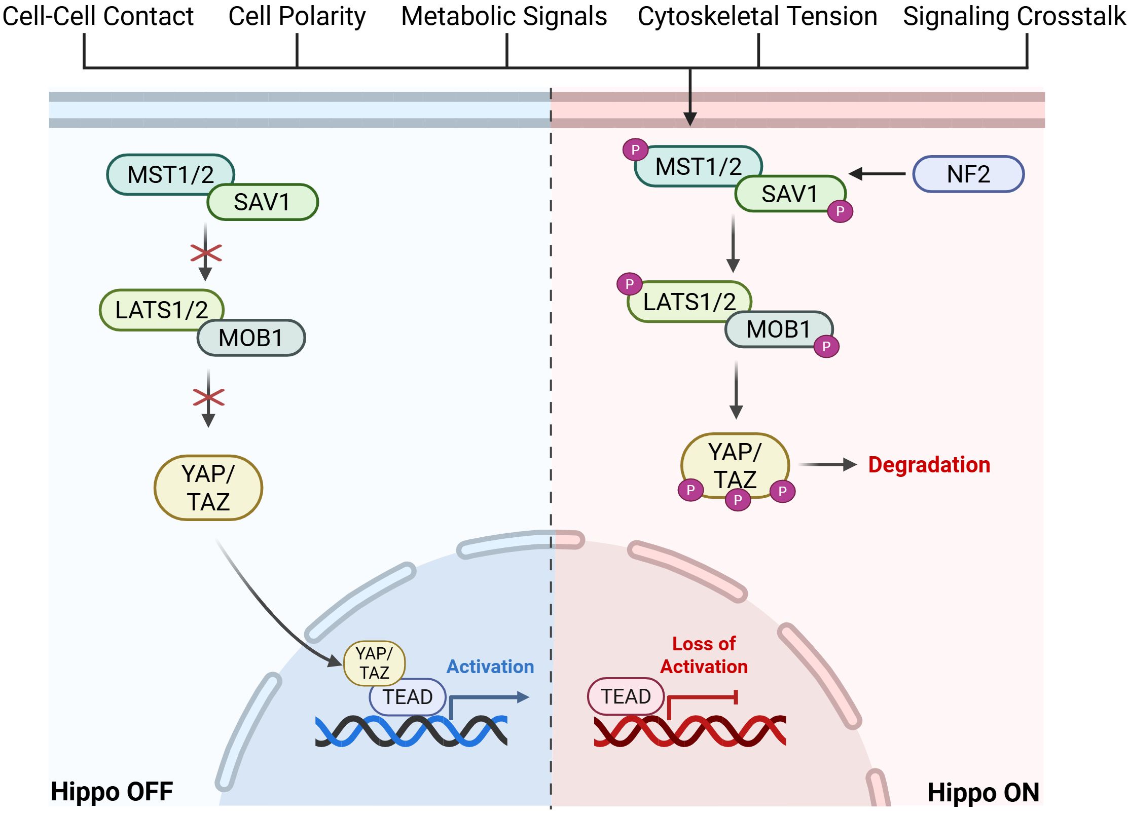 Figure 1. Graphical visualization of Hippo Pathway kinase cascade leading to activation or inactivation of downstream TEAD signaling. Created in BioRender. Battina, R. (2025) https://BioRender.com/1b0g0po.