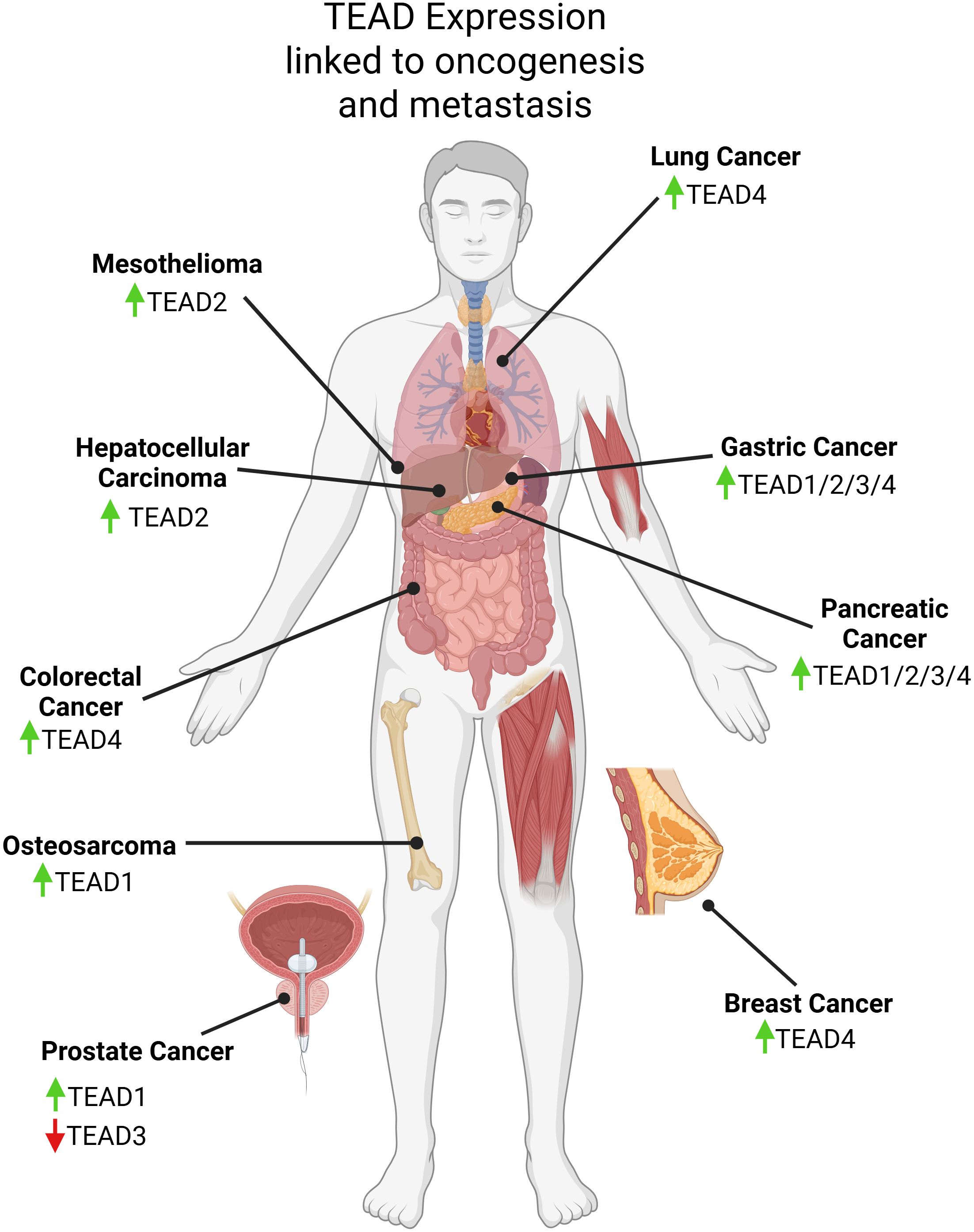 Figure 2. Graphical visualization of expression changes in TEAD family members linked to oncogenesis, metastasis, and patient survival discussed in this review. Created in BioRender. Battina, R. (2025) https://BioRender.com/1kkcq8x.