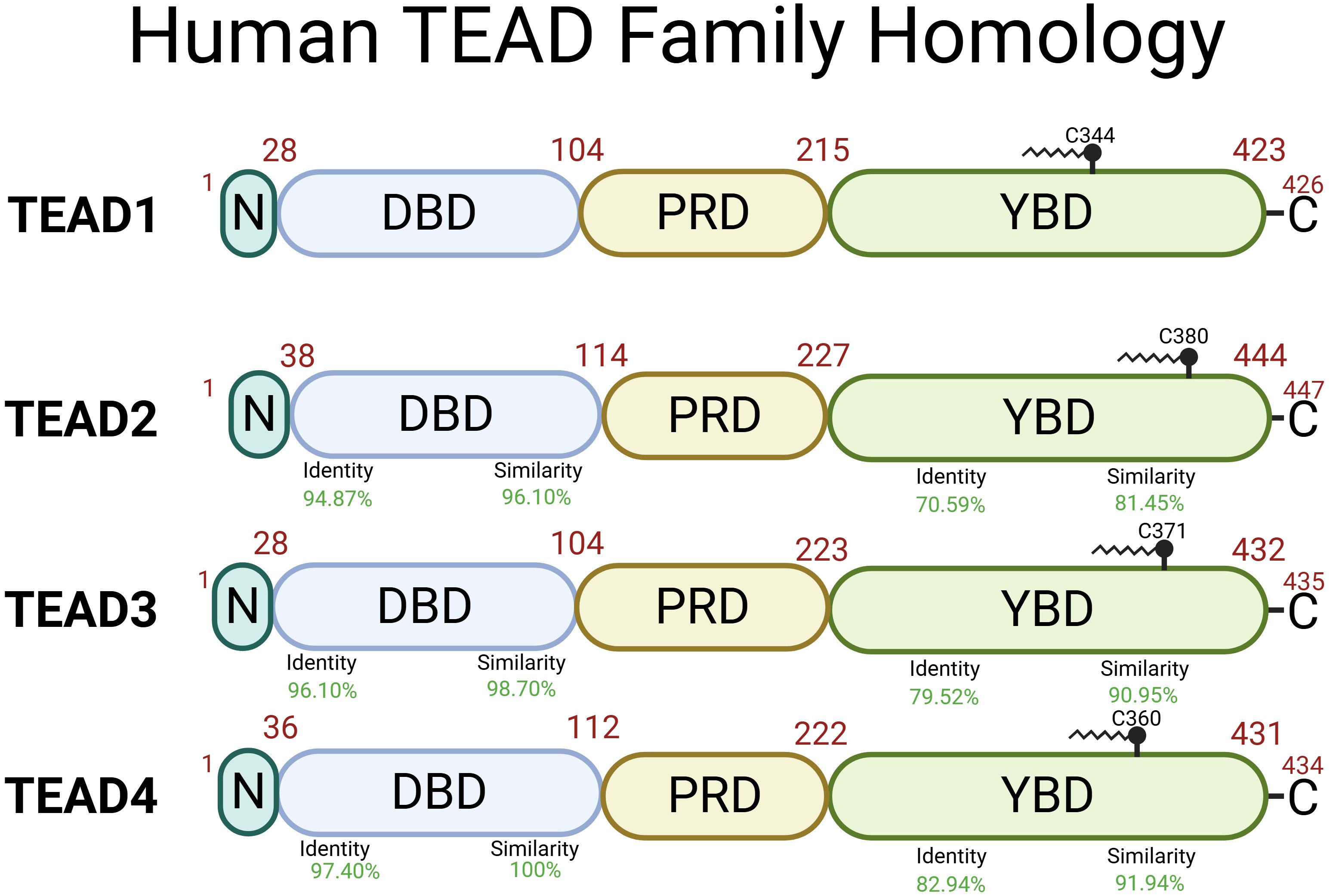 Figure 3. Human TEAD1–4 proteins share two highly conserved regions with the DNA Binding Domain (DBD) and the YAP Binding Domain (YBD) and less conserved regions including N-terminal domain (N) and the proline-rich domain (PRD). TEAD1 (Uniprot ID: P28347), TEAD2 (Uniprot ID: Q15562), TEAD3 (Uniprot ID: Q99594), TEAD4 (Uniprot ID: Q15561) structural function is dependent on palmitoylation at Cys344, Cys380, Cys371, and Cys360, respectively (93). Identity (DNA sequence) and similarity (amino acid sequence) percentage are relative to TEAD1. Created in BioRender. Battina, R. (2025) https://BioRender.com/8wzltok.