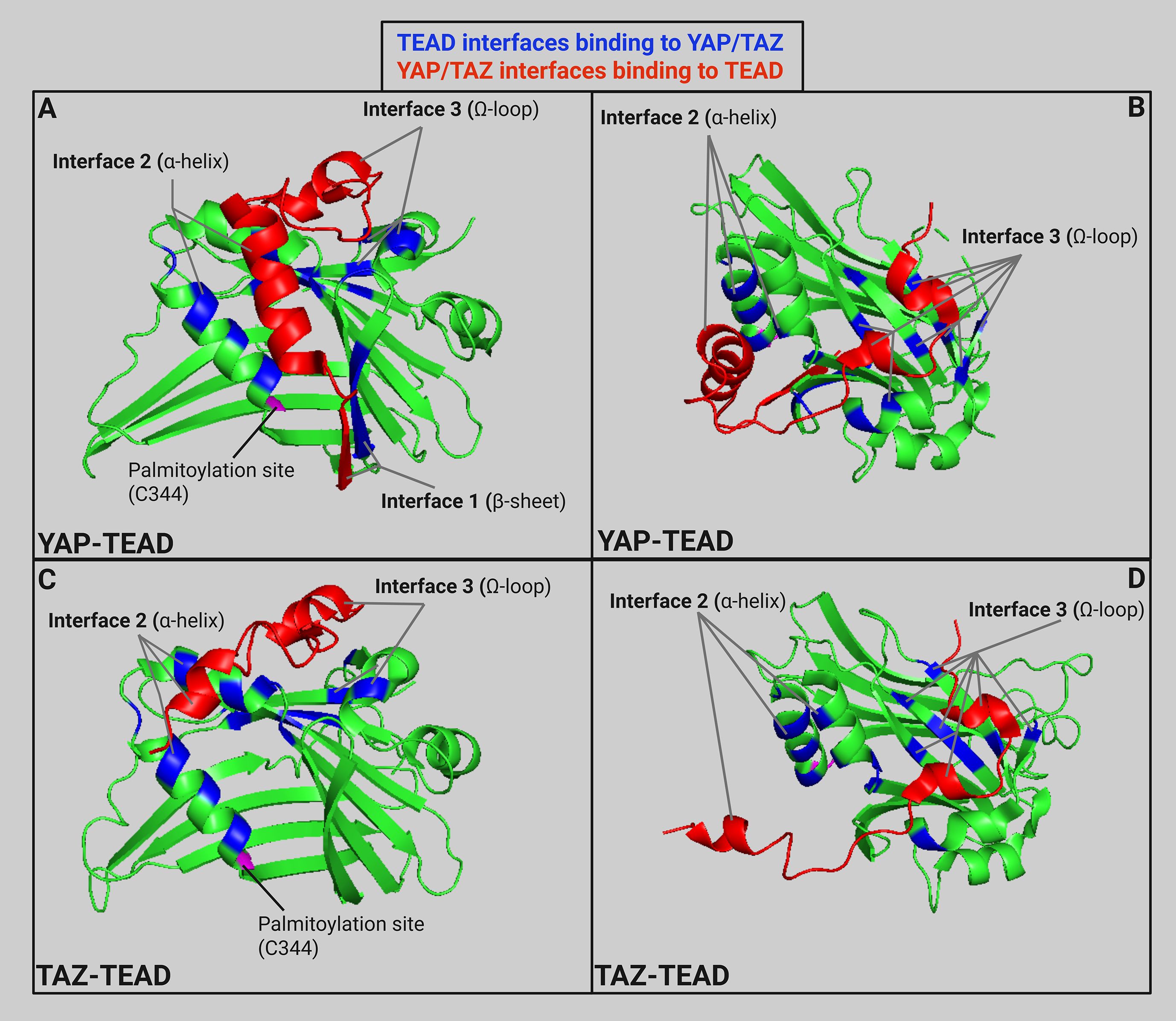 Figure 4. (A) Ribbon model (PDB: 3KYS (96)) of TEAD1 (amino acids 191-411) in green with specific TEAD interfaces in blue and partial YAP structure (amino acids 52-100) in red to highlight three main interfaces for YAP-TEAD binding. (B) YAP-TEAD interface rotated 60° on the x-axis and -60° on the z-axis. (C) Ribbon model (PDB: 5GN0 (97)) of TEAD1 (amino acids 191-411) in green with specific TEAD interfaces in blue and partial TAZ structure (amino acids 26-57) in red to highlight the main interfaces for TAZ-TEAD binding. (D) TAZ-TEAD interface rotated rotated 60° on the x-axis and -60° on the z-axis. Ribbon models created in Pymol and labeled using Biorender (98). Created in BioRender. Battina, R. (2025) https://BioRender.com/6ltz8nc.