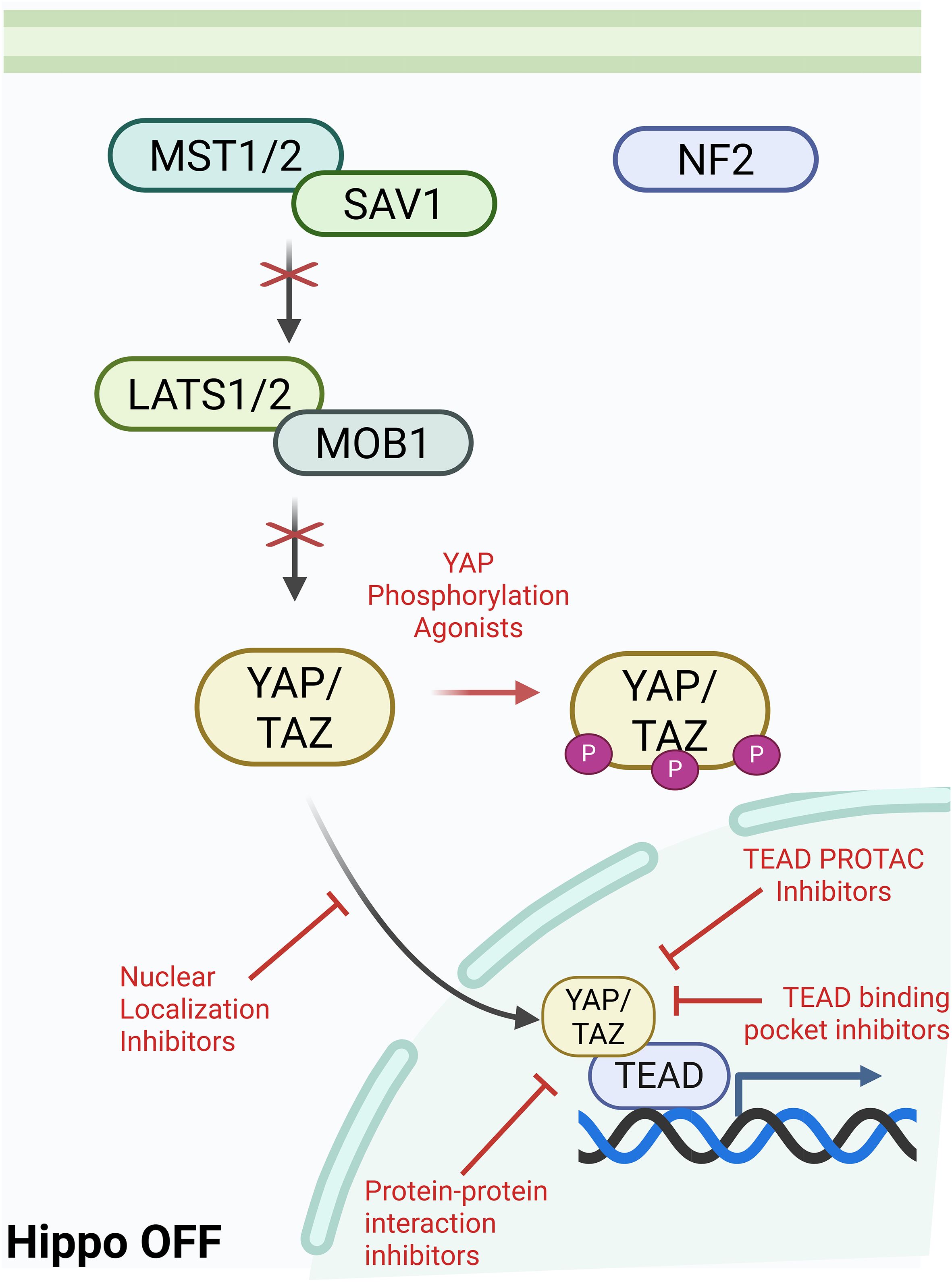 The Hippo pathway is a highly conserved pathway with core components discovered in, but not limited to, Drosophila and mammals (26). It involves a kinase cascade where proteins phosphorylate and activate one another, ultimately regulating the phosphorylation of YAP and TAZ and their interaction with TEADs (Figure 1).