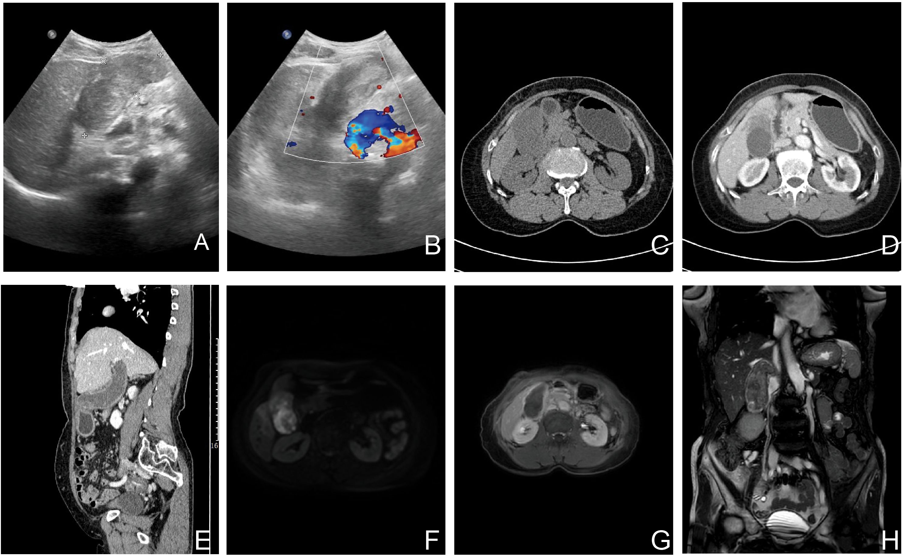Figure 1. Preoperative imaging of the GBCS (Ultrasound, CT and MRI). Color doppler ultrasound images: (A, B) The images show a hypoechoic mass with well-defined margins. The Doppler signals (red and blue) demonstrate the vascular distribution around the lesion. These findings have some value in the preoperative differentiation between benign and malignant lesions but are non-specific. (C-E) Unenhanced and contrast-enhanced CT demonstrate an enlarged gallbladder with diffuse wall thickening and enhancement upon contrast administration. (F-H) Diffusion-weighted imaging (DWI), contrast-enhanced T1-weighted, and T2-weighted coronal images show gallbladder wall thickening accompanied by enhancement and restricted diffusion. These findings are highly suggestive of malignancy.