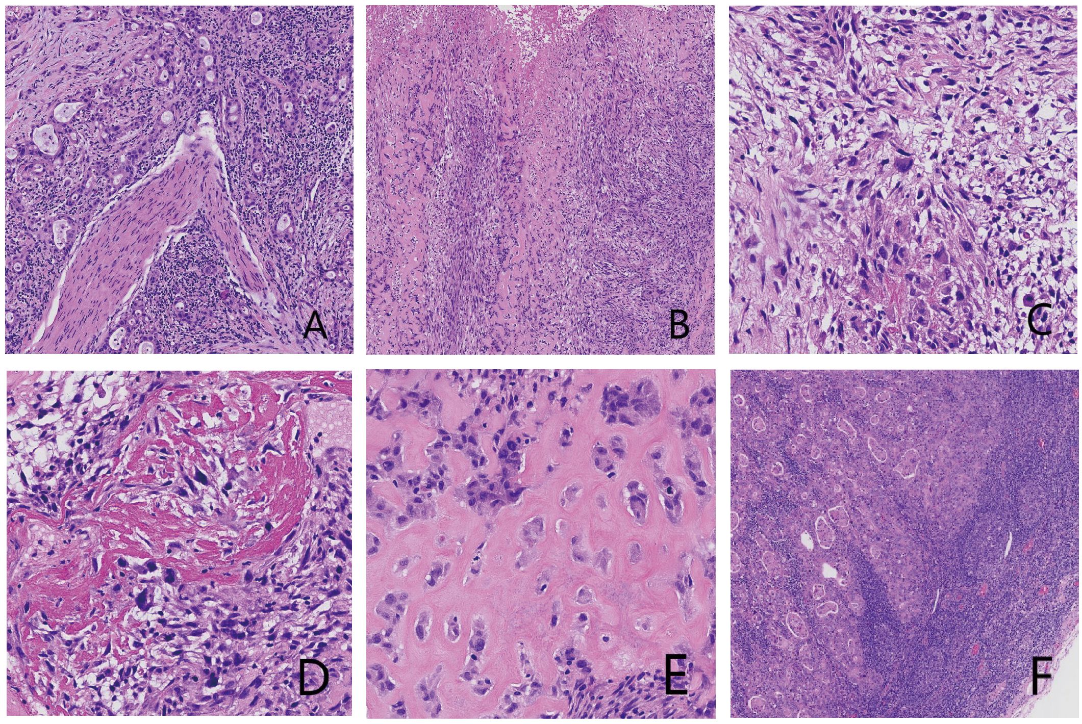 Figure 2. Histopathological micrographs of tumor tissue with hematoxylin and eosin (H&E) staining: (A) Adenocarcinoma component. Central adenocarcinoma tissue with perineural invasion is observed. (B) Mesenchymal component, showing cellular dense and loose areas. (C) Lower magnification of the mesenchymal component. Spindle-shaped cells with eosinophilic and pale cytoplasm are present; a multinucleated giant cell is visible in the center. (D) Ossified area. (E) Eosinophilic osteoid matrix with polygonal cells exhibiting hyperchromatic nuclei. (F) Lymph node metastasis composed of adenocarcinoma.