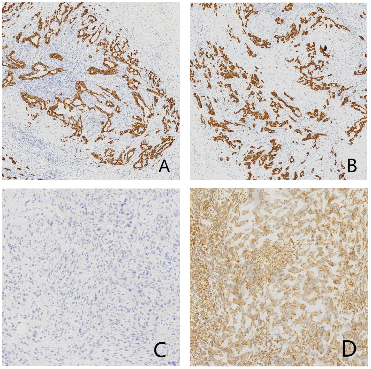 Figure 3. Immunohistochemical (IHC) micrographs of tumor tissue: (A) Positive expression of CK in the carcinomatous component. (B) Positive expression of CK19 in the adenocarcinoma component. (C) Negative expression of CK in the mesenchymal component. (D) Positive expression of vimentin in the mesenchymal component.