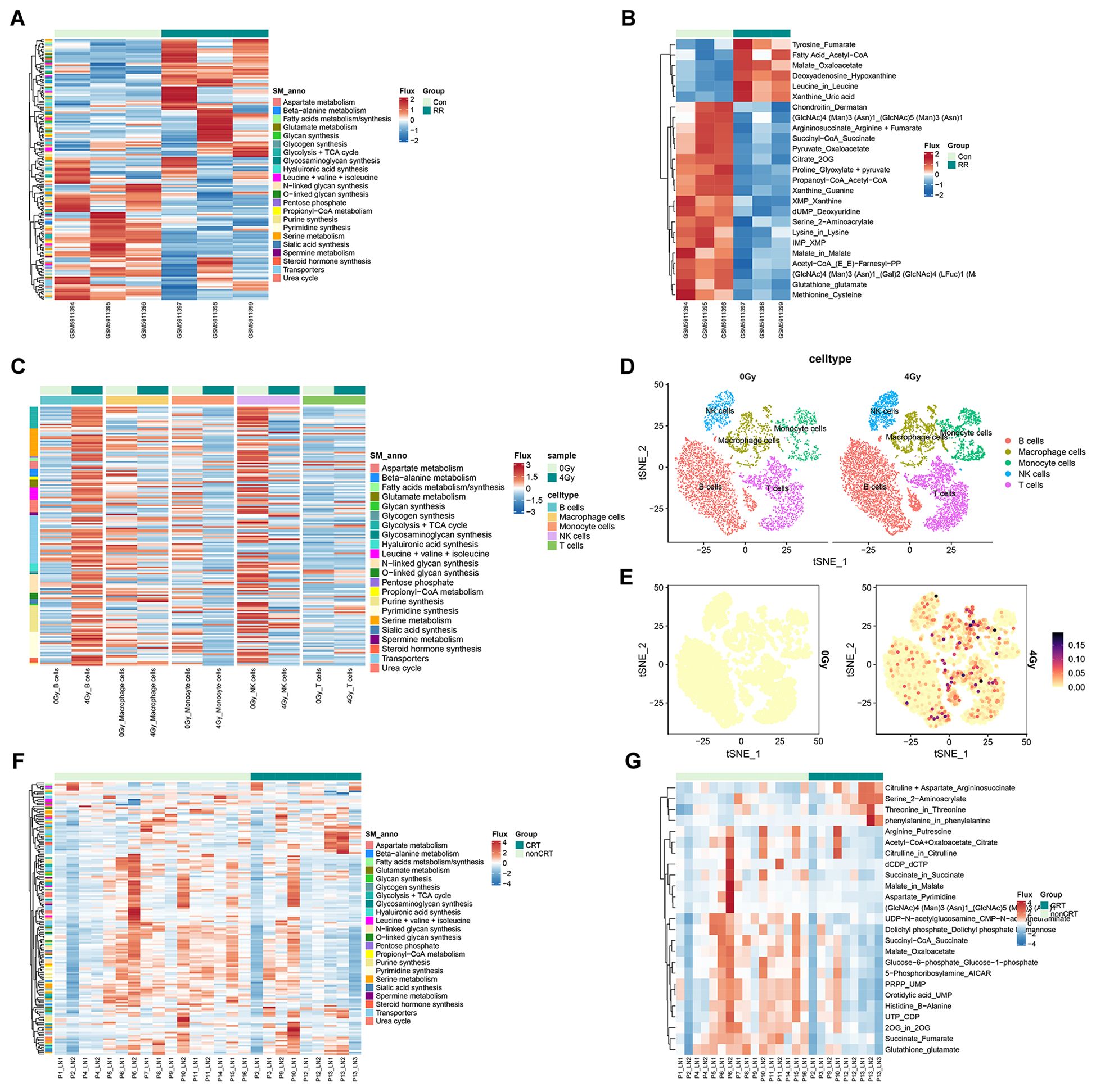 Figure 1. Metabolic reprogramming in the TIME associated with radiotherapy. (A) Overview of all 168 metabolic flux pathways (divided into 22 supermodules) in A549 parental and radioresistant cells. (B) Heatmap of the 25 significantly different metabolic fluxes between A549 parental and radioresistant cells (P<0.05). (C) Heatmap of metabolic fluxes in various immune cells before and after radiotherapy. (D) Single-cell clusters of mouse HKP1 lung orthotopic carcinoma before and after radiotherapy (3×4 Gy). (E) Cluster of metabolic flux changes in serine metabolism (M30 flux) in various immune cells before and after radiotherapy. (F, G) Overview of all 168 metabolic flux pathways (divided into 22 supermodules) in tumor-draining lymph nodes (TDLNs) from NSCLC patients with primary tumors that were untreated (nonCRT) or treated with chemoradiotherapy (CRT). Among these, 21 metabolic fluxes showed significant differences between the two groups (P<0.05).
