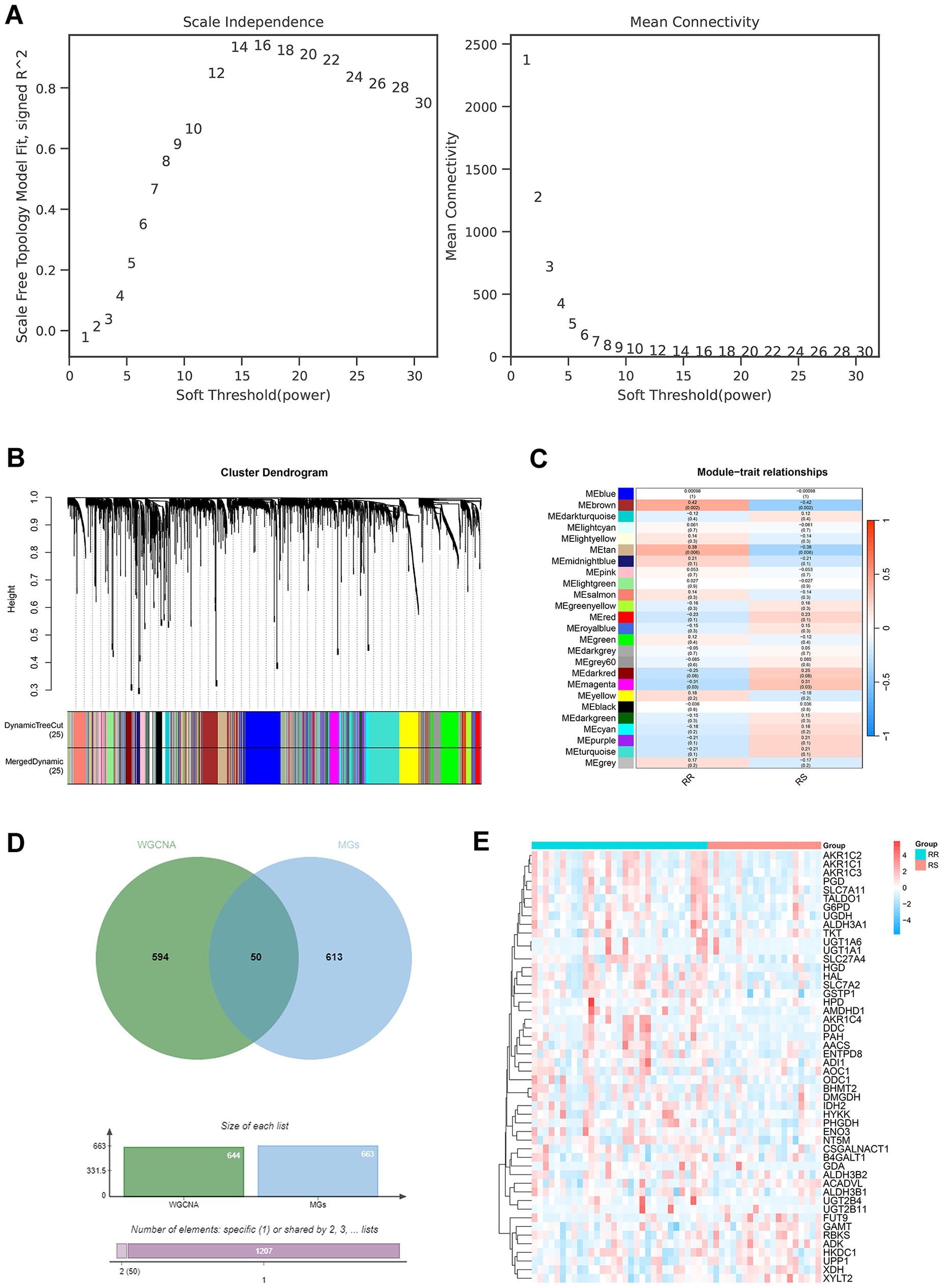 Figure 2. Identification of co-expression gene modules associated with radioresistance. (A) Selection of soft threshold based on scale-free topology. (B) Selection of soft threshold based on average connectivity. (C) Dendrogram of genes associated with radiotherapy. (D) Heatmap of the correlation between gene co-expression modules and radiotherapy response. (E) Venn diagram illustrating the selection of radioresistance-related metabolic genes (RRMGs). (F) Heatmap showing the expression levels of RRMGs in the RR group and the RS group.