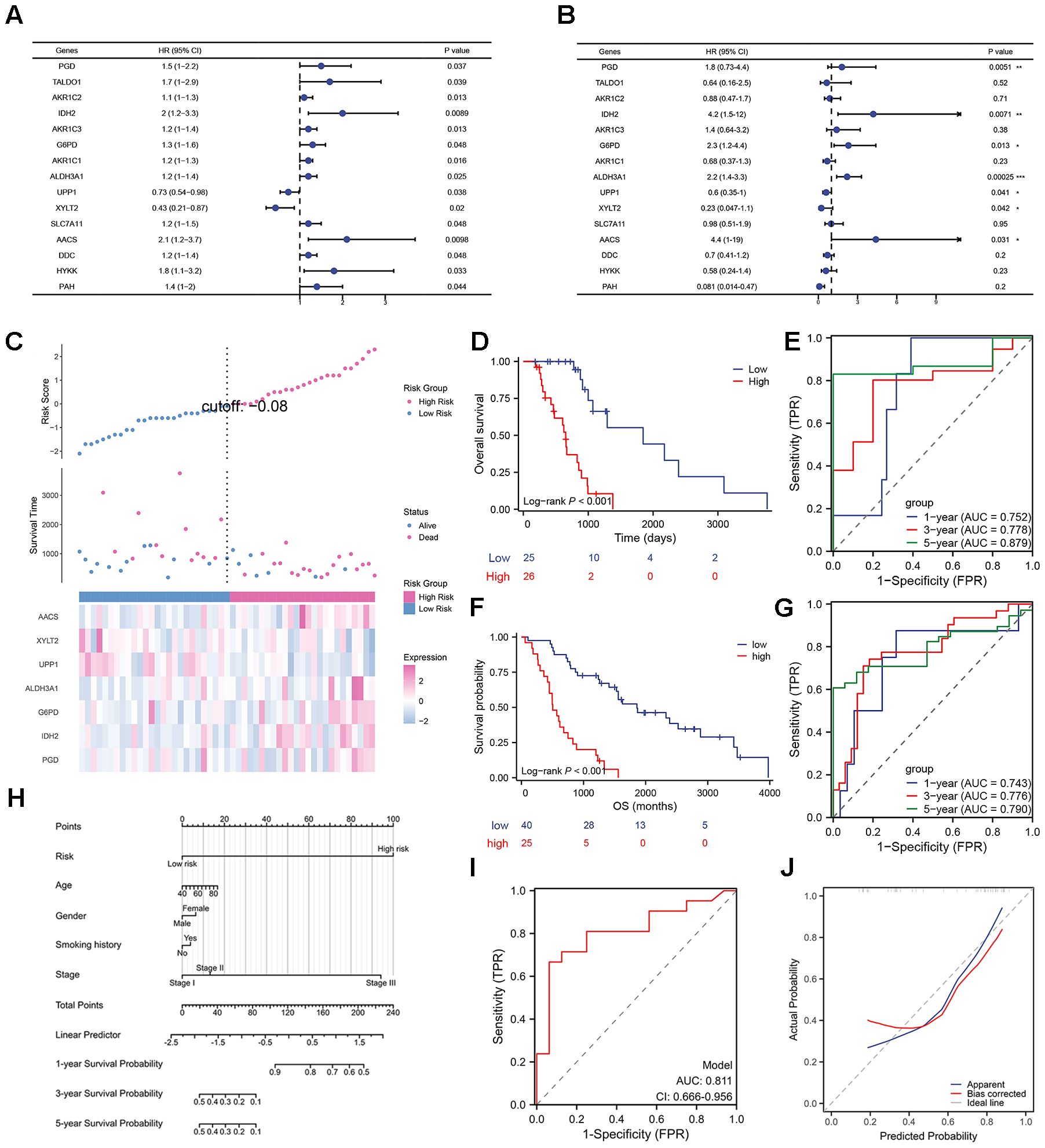 Based on these seven key RRMGs, a multivariate Cox regression prognostic model was constructed. The risk score was calculated as follows: Risk score = (0.3153 × PGD expression) + (0.7059 × IDH2 expression) + (0.4029 × G6PD expression) + (0.4784 × ALDH3A1 expression) + (0.8238 × AACS expression) - (0.3972 × UPP1 expression) - (0.3711 × XYLT2 expression). Patients with LUAD were stratified into high- and low-risk groups based on the median risk score. Kaplan-Meier analysis demonstrated significantly shorter overall survival in the high-risk group compared to the low-risk group (HR = 4.726 [95% CI: 2.154-10.371], p < 0.001) (Figure 3D). The AUC values for 1-, 3-, and 5-year follow-up were 0.752, 0.778, and 0.879, respectively (Figure 3E).