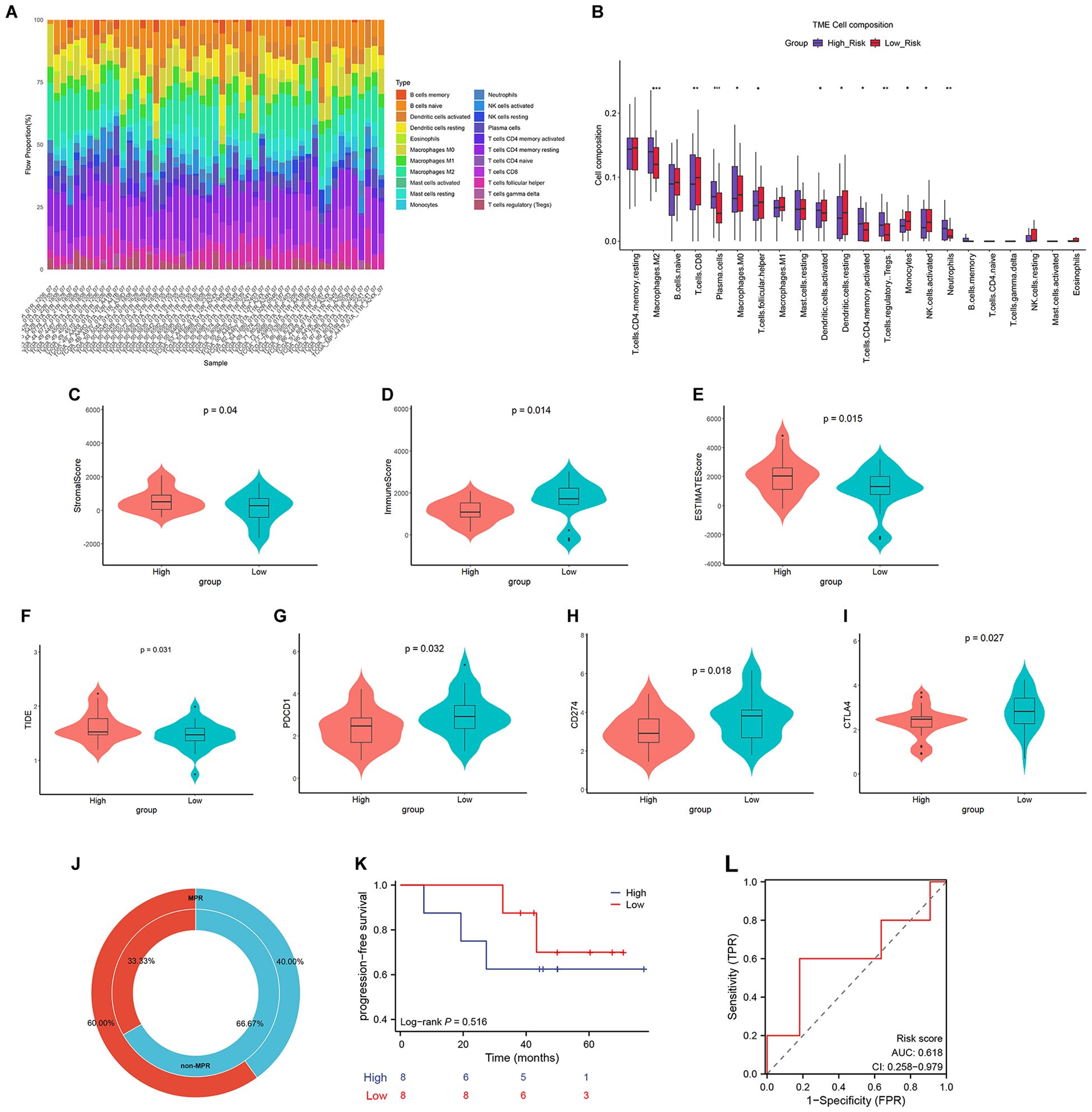 Figure 4. Tumor immune microenvironment, immune therapy sensitivity, and prognosis of the RRMG model in radioimmunotherapy. (A) Distribution of immune cells in LUAD patients receiving radiotherapy. (B) Immune cell infiltration levels in different risk subgroups of LUAD patients. (C–E) ESTIMATE analysis metrics (Stromal Score, Immune Score, and ESTIMATE Score) in different risk subgroups. (F) TIDE scores in different risk subgroups. (G–I) Expression of immune checkpoints PDCD1, CD274, and CTLA4 in different risk subgroups. (J) Donut chart showing the proportion of high- and low-risk groups in MRP and non-MRP. (K) PFS curves for high- and low-risk groups. (L) ROC curves and AUC values of the RRMG prognostic model. *P<0.05, **P<0.01, ***P<0.001.