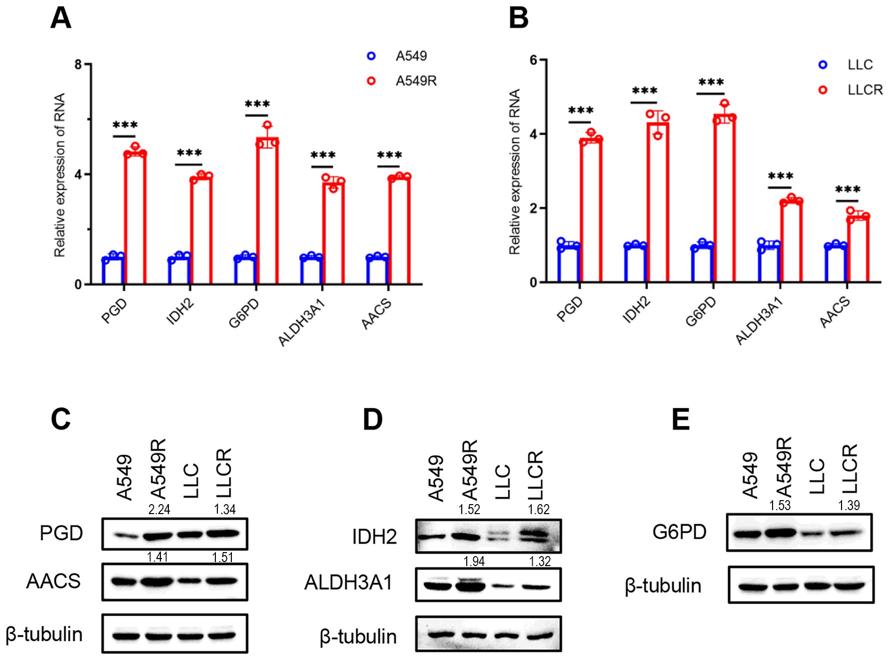 To investigate the expression profiles of high-risk RRMGs in radioresistant NSCLC cells, radiation-resistant cell lines A549R and LLCR were successfully established by subjecting A549 and LLC cells to fractionated irradiation with a cumulative dose of 60 Gy. qRT-PCR and Western blot analyses demonstrated that both mRNA and protein expression levels of PGD, IDH2, G6PD, ALDH3A1, and AACS were significantly upregulated in the radioresistant cells (Figures 5A–E). These findings not only validate the reliability of our analytical results but also suggest that these genes may play a critical regulatory role in the development of radioresistance in NSCLC.