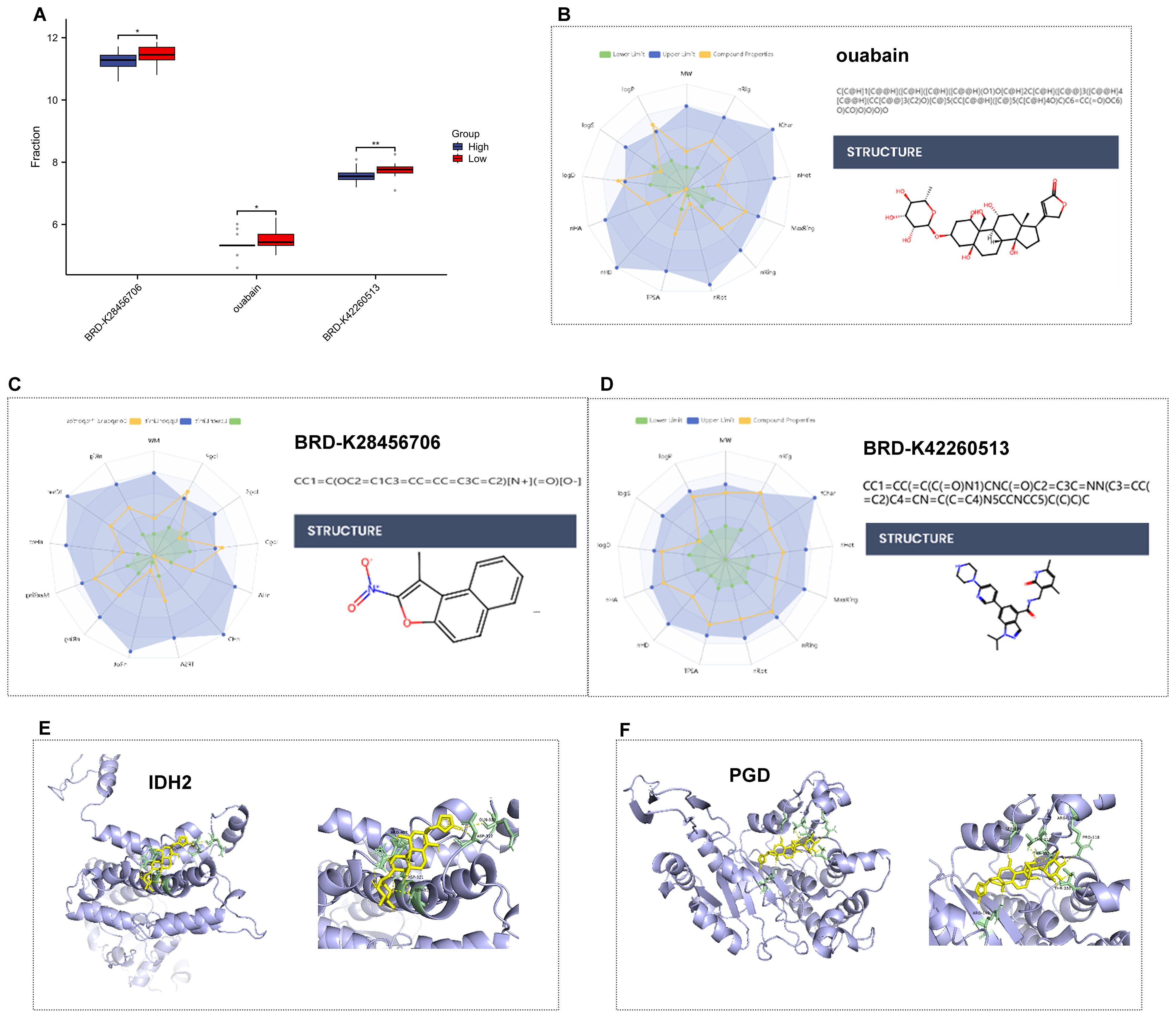 Figure 6. Candidate radio-immunotherapy sensitizers for high-risk patients. (A) Drug response results for potential therapeutic agents (BRD-K42260513, ouabain, and BRD-K28456706) across different risk subgroups. (B–D) Molecular structures of the three potential therapeutic agents (BRD-K42260513, ouabain, and BRD-K28456706). (E) Predicted 3D docking models of IDH2 with the compound ouabain. (F) Predicted 3D docking models of PGD with the compound ouabain. *P<0.05, **P<0.01.
