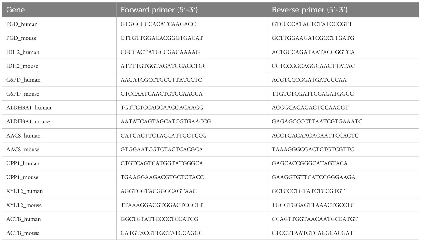 Whole cell mixtures were separated using cell complete lysis buffer for western and IP (Beyotime, item number: P0037-100ml, Shanghai, China), protease inhibitor, and protein phosphatase inhibitor mixtures. The protein concentration was measured by using BCA protein concentration rapid determination kit (Beyotime, Shanghai, China). Equal amounts of proteins were separated on 10% SDS-PAGE and transferred to a 0.45 μm PVDF membrane (Millipore, IPFL00005, Darmstadt, Germany). The membranes were closed with 5% skimmed milk and incubated with primary antibodies, including anti-PGD (Abways, DY1193, Beijing, China), anti-IDH2 (Abways, CY7005), anti-G6PD (Abways, CY6841), anti-ALDH3A1 (Proteintech, 20874–1-AP, Wuhan, China), anti-AACS (Proteintech, 13815-1-AP) and anti-β-tubulin (Cell Signaling Technology, #2146S, Danvers, MA, USA), overnight at 4 °C. They were then incubated in secondary IgG (ABclonal, AS014, Wuhan, China) for 1 h at room temperature. Protein bands were visualized using Super ECL detection reagent (Vazyme, Nanjing, China). Grayscale analysis of protein bands was performed using Image J software.