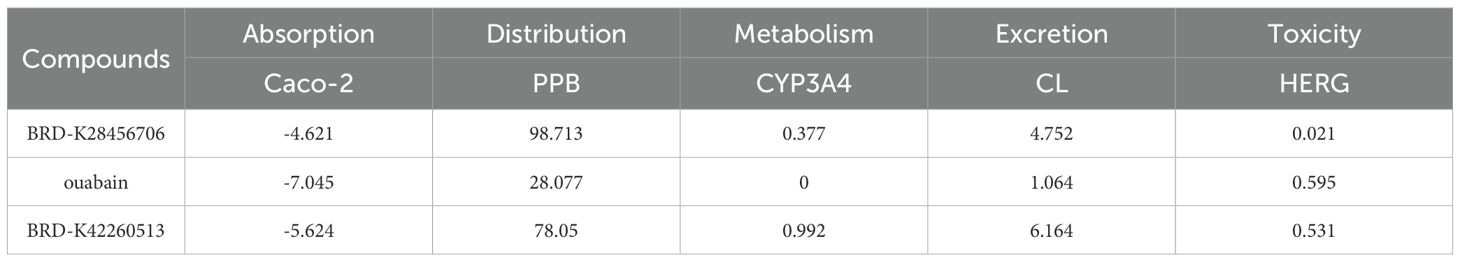 To identify potential radiosensitizers and immunotherapy sensitizers applicable to high-risk patients, we evaluated differences in drug sensitivity among distinct risk subgroups based on drug response data predicted by the “oncoPredict” R package. By screening for drugs exhibiting higher sensitivity in the high-risk population, differential drug response analysis was first performed to identify compounds with significant differences, retaining only those with lower half-maximal inhibitory concentration (IC50) estimates in the high-risk group. Three drugs/compounds demonstrating potential therapeutic value for high-risk patients were ultimately identified: BRD-K42260513, ouabain, and BRD-K28456706 (Figures 6A–D). Analysis of absorption, distribution, metabolism, excretion, and toxicity (ADMET) properties revealed that ouabain exhibited the most favorable overall profile, followed by BRD-K28456706 and BRD-K42260513 (Table 2). For in-depth analysis of these three candidates, molecular docking was performed between five high-risk radioresistance-associated metabolic proteins (PGD, IDH2, G6PD, ALDH3A1, and AACS) and the candidate drugs. Figures 6E, F illustrate the docking models of PGD and IDH2 with ouabain, demonstrating binding free energies of -7.9 kcal/mol and -8.7 kcal/mol, respectively. These candidate drugs show promise asradiosensitizers or radioimmunotherapy sensitizers for NSCLC treatment.