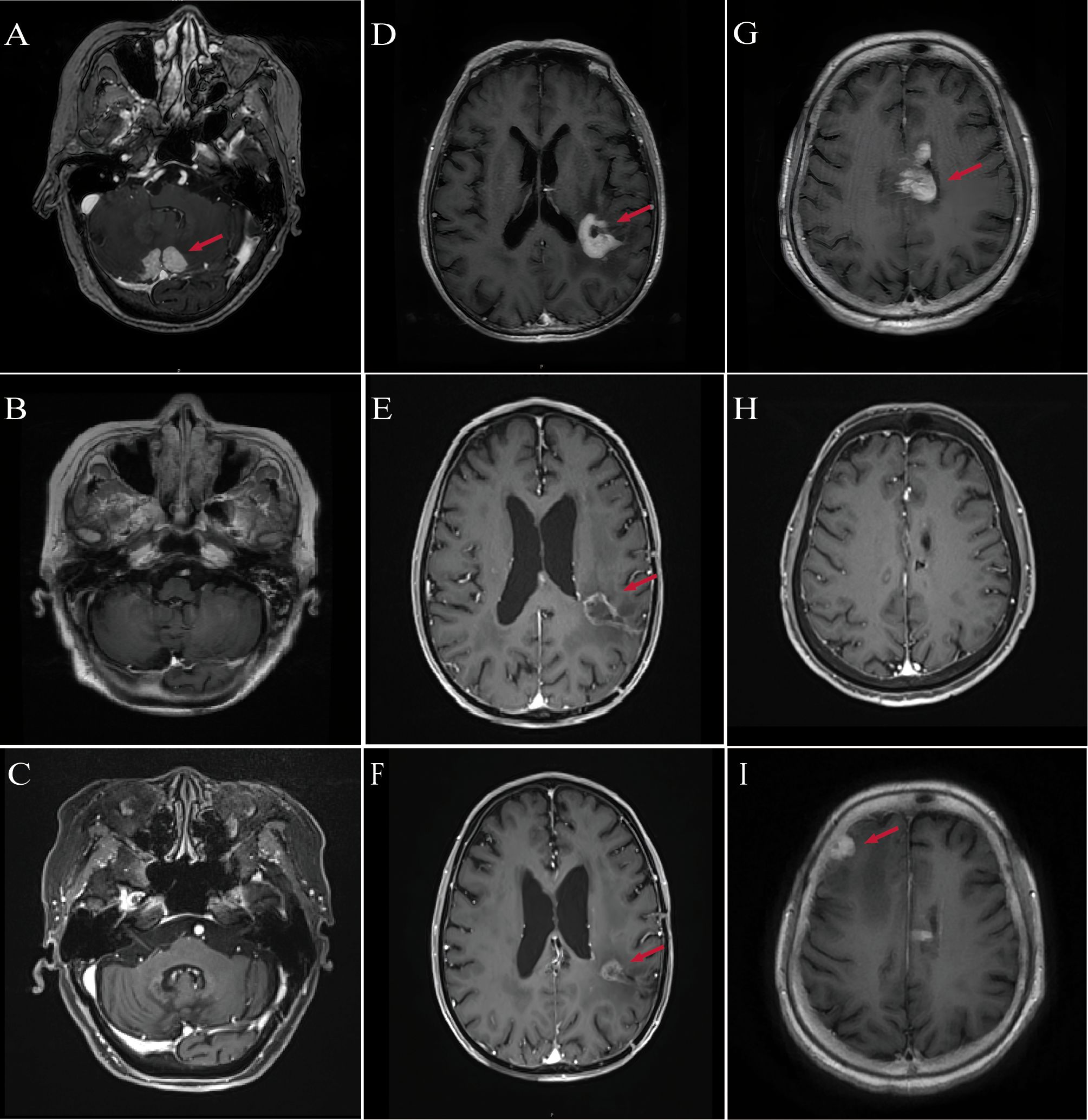 Figure 1. MRI imaging of patients diagnosed with PCNSL. (A) Patient #1: Baseline contrast-enhanced MRI shows bilateral cerebellar lesions (red arrows), consistent with PCNSL. (B) Patient #1: Follow-up MRI at 3 months post-treatment shows complete resolution of cerebellar lesions. (C) Patient #1: MRI at 29 months post-treatment confirms sustained complete remission. (D) Patient #2: Baseline MRI reveals enhancing lesions in the left parietal lobe, midbrain, and thalamus (red arrows). (E) Patient #2: MRI at 3 months post-treatment reveals a 40% reduction in tumor size compared with baseline. (F) Patient #2: MRI at 7 months post-treatment shows approximately 50% reduction in lesion diameter relative to baseline. (G) Patient #3: Baseline MRI reveals multifocal lesions involving the periventricular areas, lateral ventricles, fourth ventricular ependyma, and corpus callosum (red arrows). (H) Patient #3: MRI at 3 months post-treatment shows near-complete remission of previously noted lesions. (I) Patient #3: MRI at 10 months post-treatment reveals recurrent enhancing lesions in the right frontotemporal region and basal ganglia.