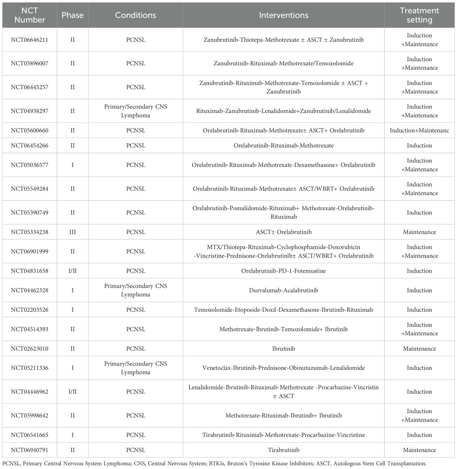 Several BTKIs, including ibrutinib, acalabrutinib, zanubrutinib, tirabrutinib, and orelabrutinib, are approved for the treatment of hematologic malignancies. Most PCNSL cases harbor MYD88 L265P and CD79B mutations, BTKIs have shown promising efficacy in relapsed or refractory cases (12, 18, 19). More recently, studies have begun to explore the role of BTKIs in newly diagnosed PCNSL, both as monotherapy and in combination with other treatments, and recent trials have validated incorporation of BTKIs into initial therapy improves efficacy (20–22). Among these agents, orelabrutinib—a highly selective second-generation BTK inhibitor with fewer off-target effects—has garnered significant attention for its potential in treating PCNSL. A retrospective analysis of 86 PCNSL patients demonstrated a 96.2% objective response rate (ORR) with BTKIs combination therapy, compared to 71.4% with traditional chemotherapy and 71.4% with radiotherapy. The median OS was also significantly better in the BTKi group, with a median OS not reached versus 47.8 months in the chemotherapy group (P = 0.038) (23). Another analysis of orelabrutinib-based regimens in newly diagnosed or relapsed/refractory PCNSL reported a 100% ORR, with all patients demonstrating progression-free survival (PFS) and OS rates of 100% at 6 months (24). While numerous ongoing trials are investigating the combination of BTKIs with chemotherapy, molecular targeted drugs, and immune checkpoint inhibitors for first-line PCNSL treatment (Table 1), there are no large-scale, prospective, randomized controlled trials evaluating BTKIs as standalone or combinatorial therapies in newly diagnosed PCNSL. Additionally, no studies have examined the combination of BTKi with reduced-dose radiotherapy.
