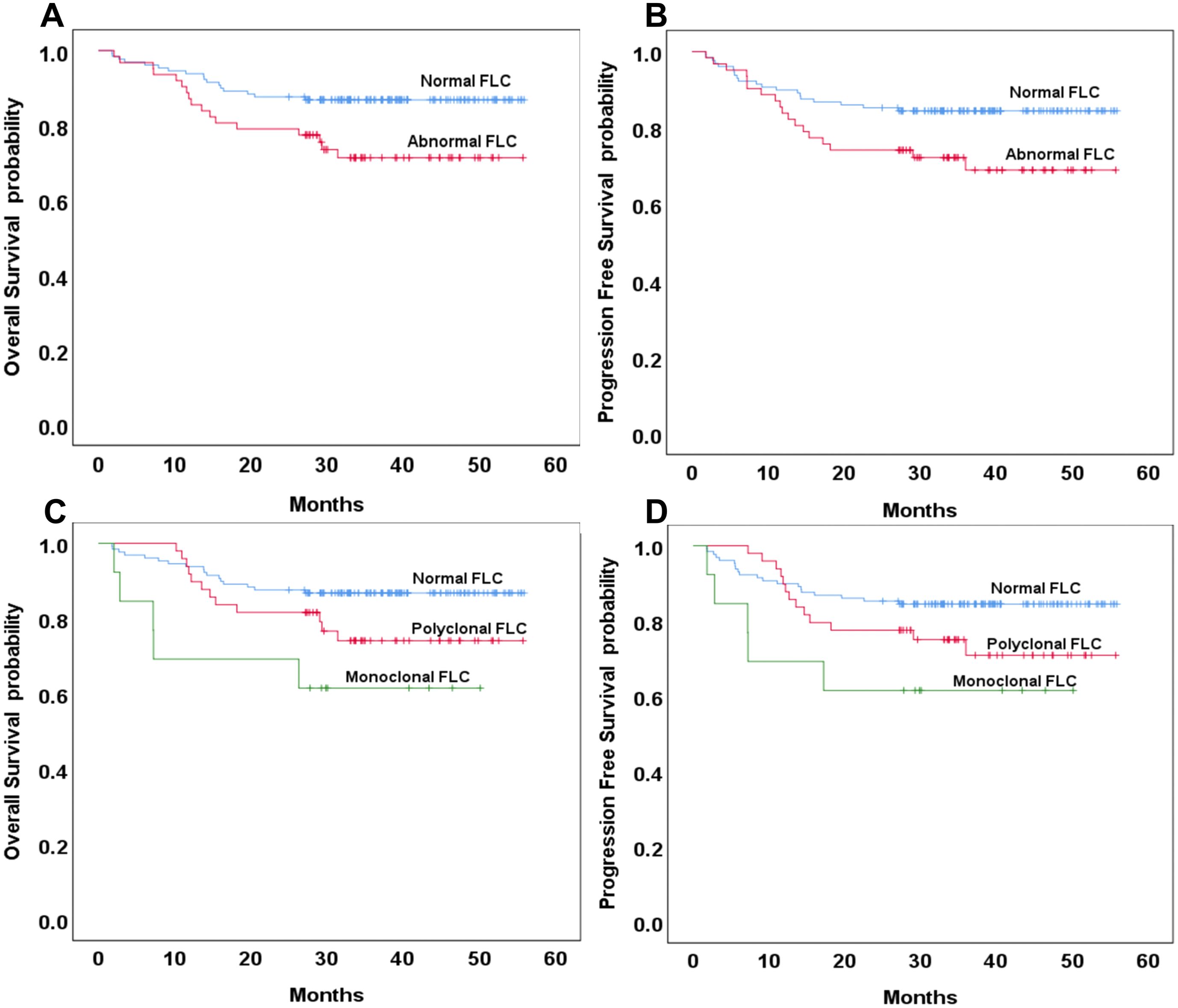 Figure 1. Overall and progression-free survival based on normal or abnormal serum free light chain (FLC) (A, B) and the presence of monoclonal or polyclonal FLC (C, D).
