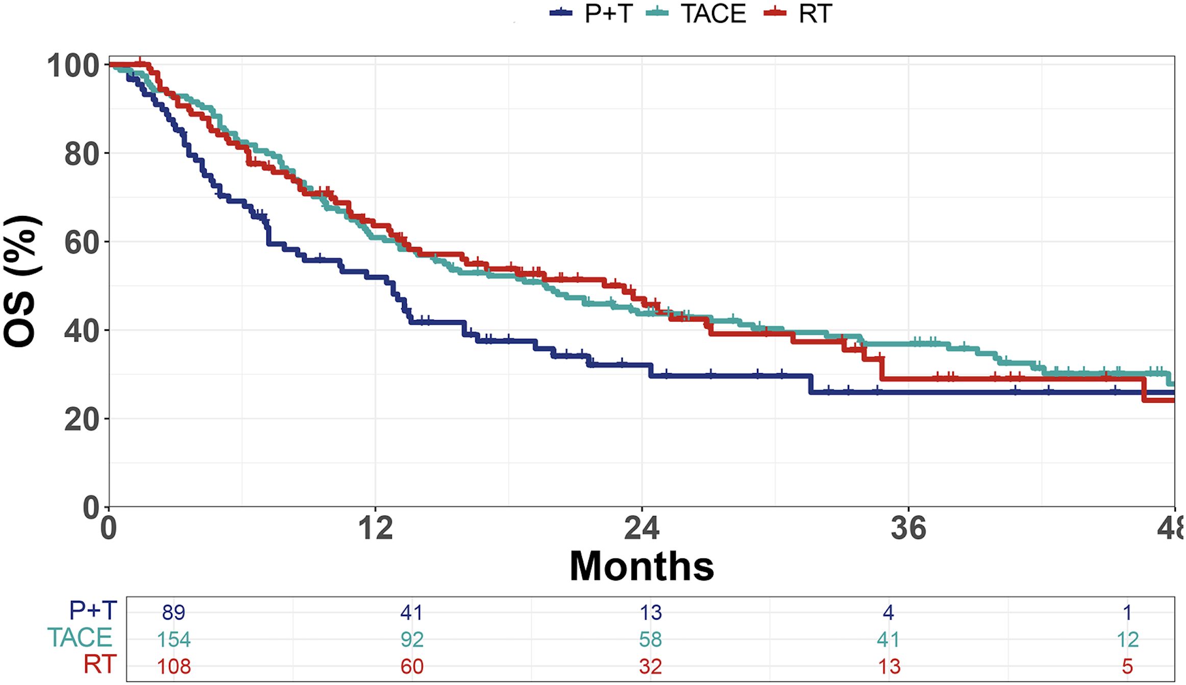 Figure 1. Kaplan–Meier curves of overall survival (OS) in patients treated with PD-1 inhibitors plus targeted therapy (P+T), transarterial chemoembolization (TACE), or radiotherapy (RT). OS, overall survival.