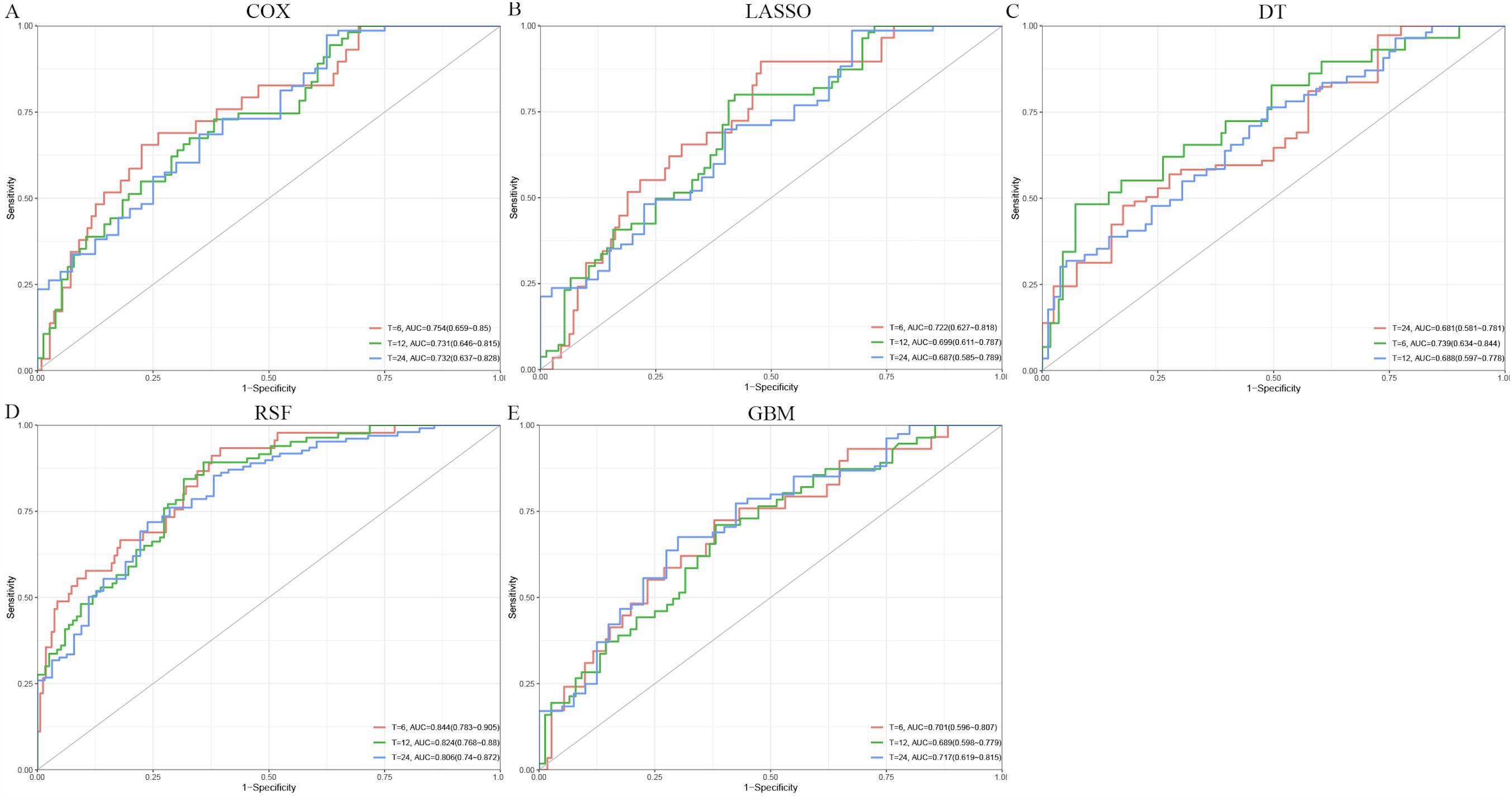 Figure 2. Receiver operating characteristic (ROC) curves for predicting overall survival using different models. (A) Cox. (B) Least absolute shrinkage and selection operator (LASSO). (C) Decision tree (DT). (D) Random survival forest (RSF). (E) Gradient boosting machine (GBM).