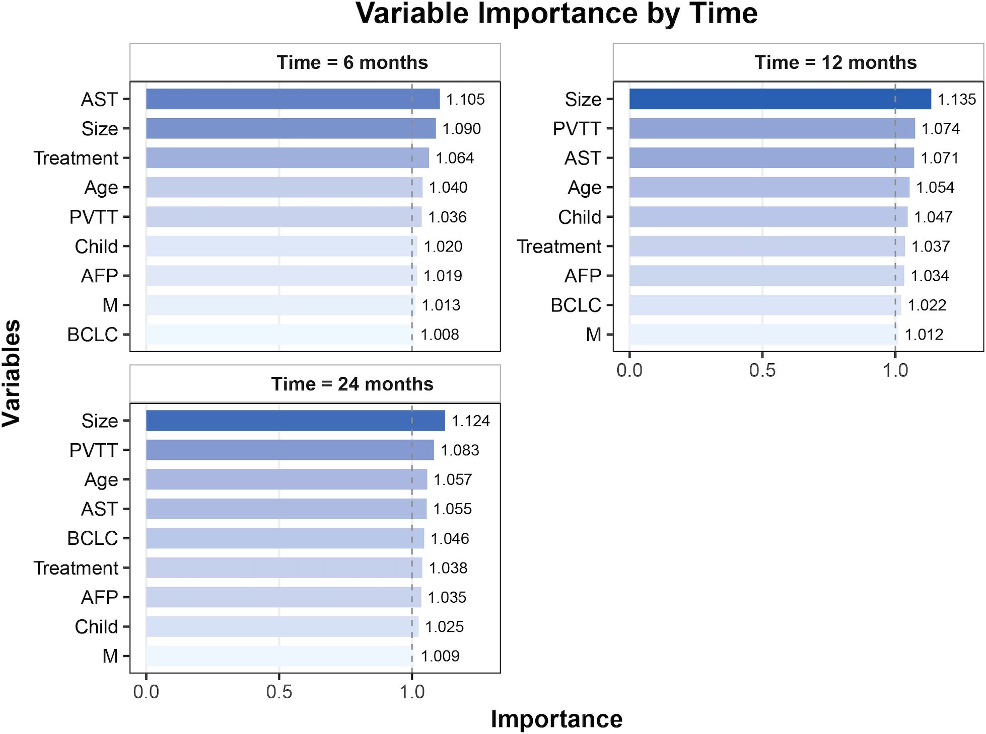 Figure 3. Variable importance for overall survival prediction at different time points (6, 12, and 24 months). AST, aspartate aminotransferase; PVTT, portal vein tumor thrombosis; AFP, alpha-fetoprotein; BCLC, Barcelona Clinic Liver Cancer; M, metastasis.
