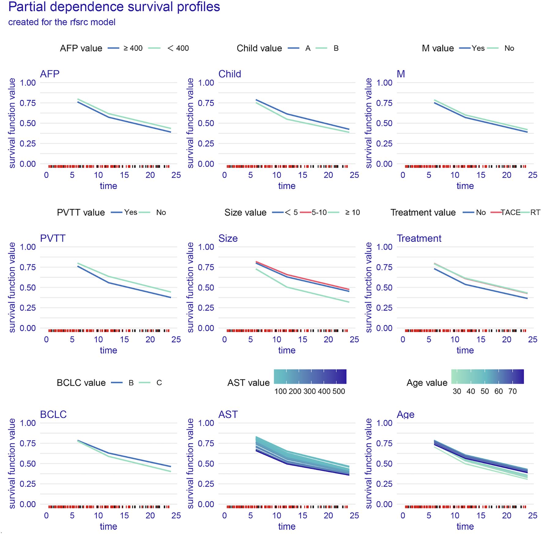 Figure 4. Partial dependence survival profiles for key clinical variables. AST, aspartate aminotransferase; PVTT, portal vein tumor thrombosis; AFP, alpha-fetoprotein; BCLC, Barcelona Clinic Liver Cancer; M, metastasis.