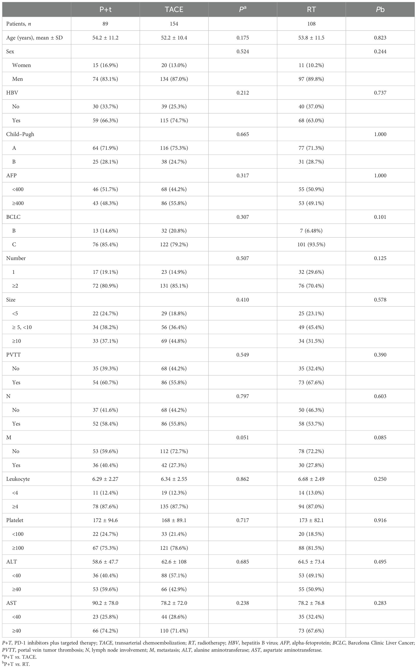 A total of 351 patients with unresectable HCC were included, with 89 in the P+T group, 154 in the TACE group, and 108 in the RT group. The majority of the patients were men (83.1%–89.8%) and positive for hepatitis B virus (HBV) (63.0%–74.7%). The majority had Child–Pugh A liver function (71.3%–75.3%) and advanced BCLC stage C disease (79.2%–93.5%). Tumor burden was high, with the majority of patients presenting with two or more nodules (70.4%–85.1%) and a large tumor size (≥5 cm in the majority). Portal vein tumor thrombus (PVTT) was present in approximately 55.8%–67.6% of patients, while extrahepatic spread (M1) was observed in 27.8%–40.4%. Compared with the P+T group, no significant differences were observed in the baseline characteristics between the TACE group and the RT group, including demographic factors, liver function, tumor burden, disease stage, and laboratory parameters (Table 1).