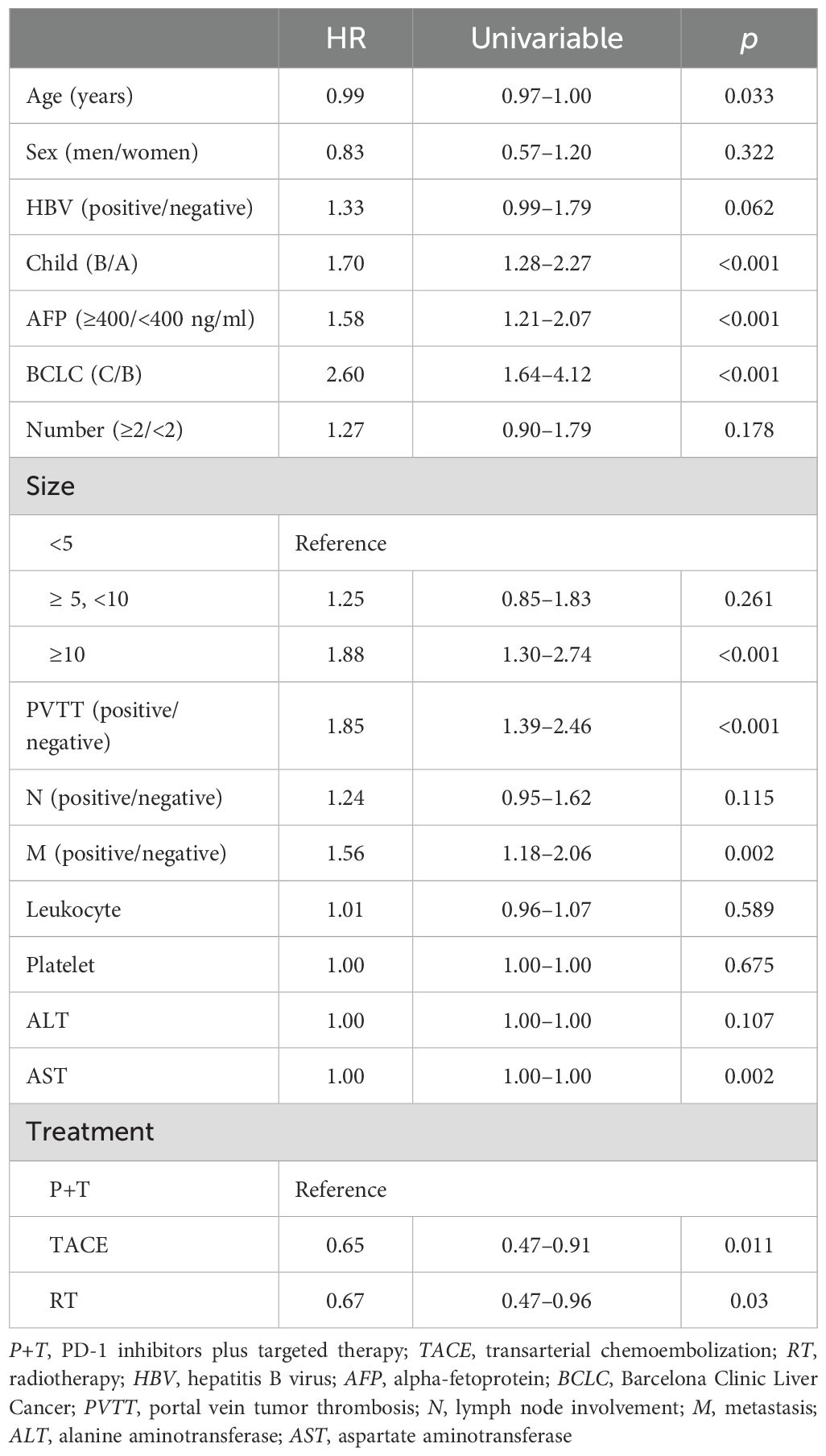 Univariable Cox analysis demonstrated that OS was significantly associated with age, the Child–Pugh score, the alpha-fetoprotein (AFP) level, the BCLC stage, the tumor size, PVTT, metastasis, aspartate aminotransferase (AST), and treatment (Table 2).