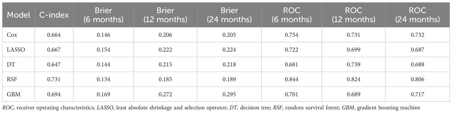 Patients were randomly divided into a training set and a validation set at a ratio of 6:4. In the training set, univariate Cox regression was first performed to identify statistically significant prognostic variables for inclusion in the subsequent machine learning models. While univariate Cox regression captures linear relationships, it may overlook complex, nonlinear interactions. To address this, several machine learning models were used, including random survival forest (RSF), least absolute shrinkage and selection operator (LASSO), gradient boosting machine (GBM), decision tree (DT), and support vector machine (SVM), in order to capture nonlinear associations and enhance the predictive accuracy. The model with the highest concordance index (C-index) in the training set was selected. In the validation set, model performance was evaluated using the Brier score, time-dependent receiver operating characteristic (ROC) curves, decision curve analysis (DCA), and calibration plots.