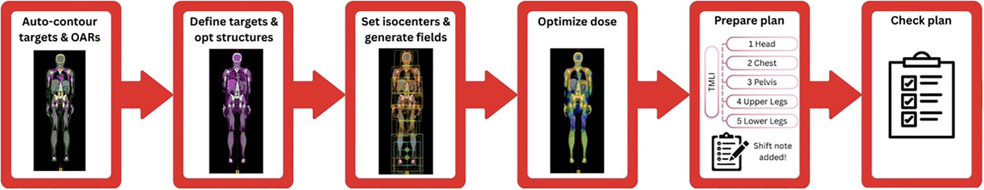 To overcome the complexity associated with VMAT-TMLI, the focus of this work was to automate the contouring, treatment planning, and physics plan check process for VMAT- TMLI. All auto-planning software in this work will be made publicly available to facilitate adoption of the auto-planning workflow by other institutions. To the authors’ knowledge, this is the first comprehensive effort to develop and share an integrated auto-contouring and auto-planning solution for VMAT-TMLI.