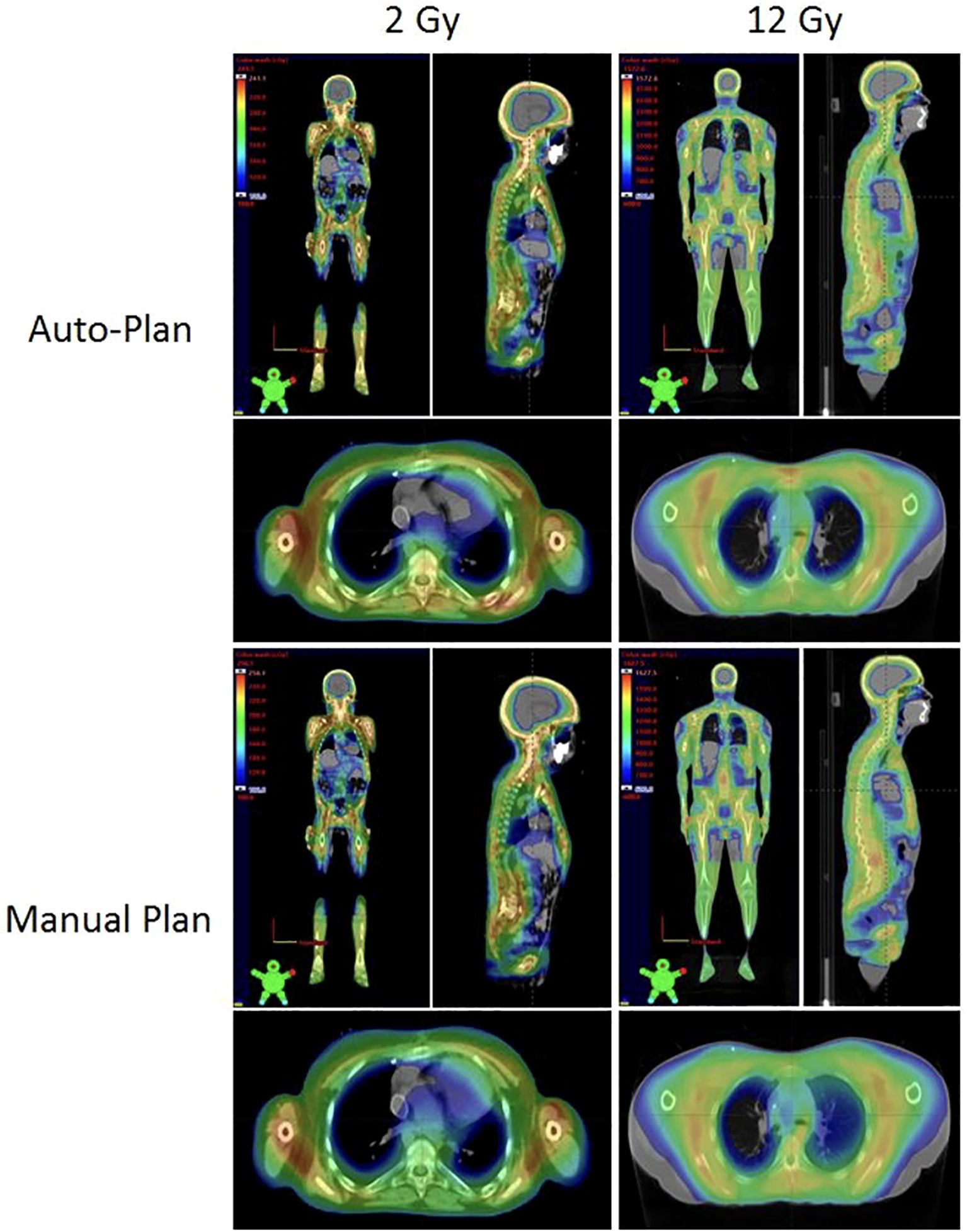 Figure 2. Comparison of the auto-plans and manual plans for adult and pediatric patients for 2 Gy and 12 Gy VMAT-TMLI regimens. The dose clouds have been thresholded to 50% of the prescription dose.