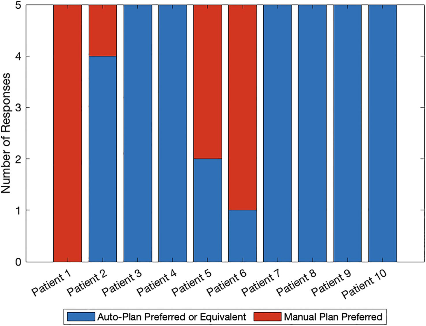 Figure 3. Blinded plan review results by 4 radiation oncologists and 1 medical physicist: blue denotes auto-plan preference or equivalence to the manual plan and red denotes manual plan preference. Patients 1–5 were planned with the 2 Gy prescription regimen whereas patients 6–10 were planned with the 12 Gy prescription regimen.