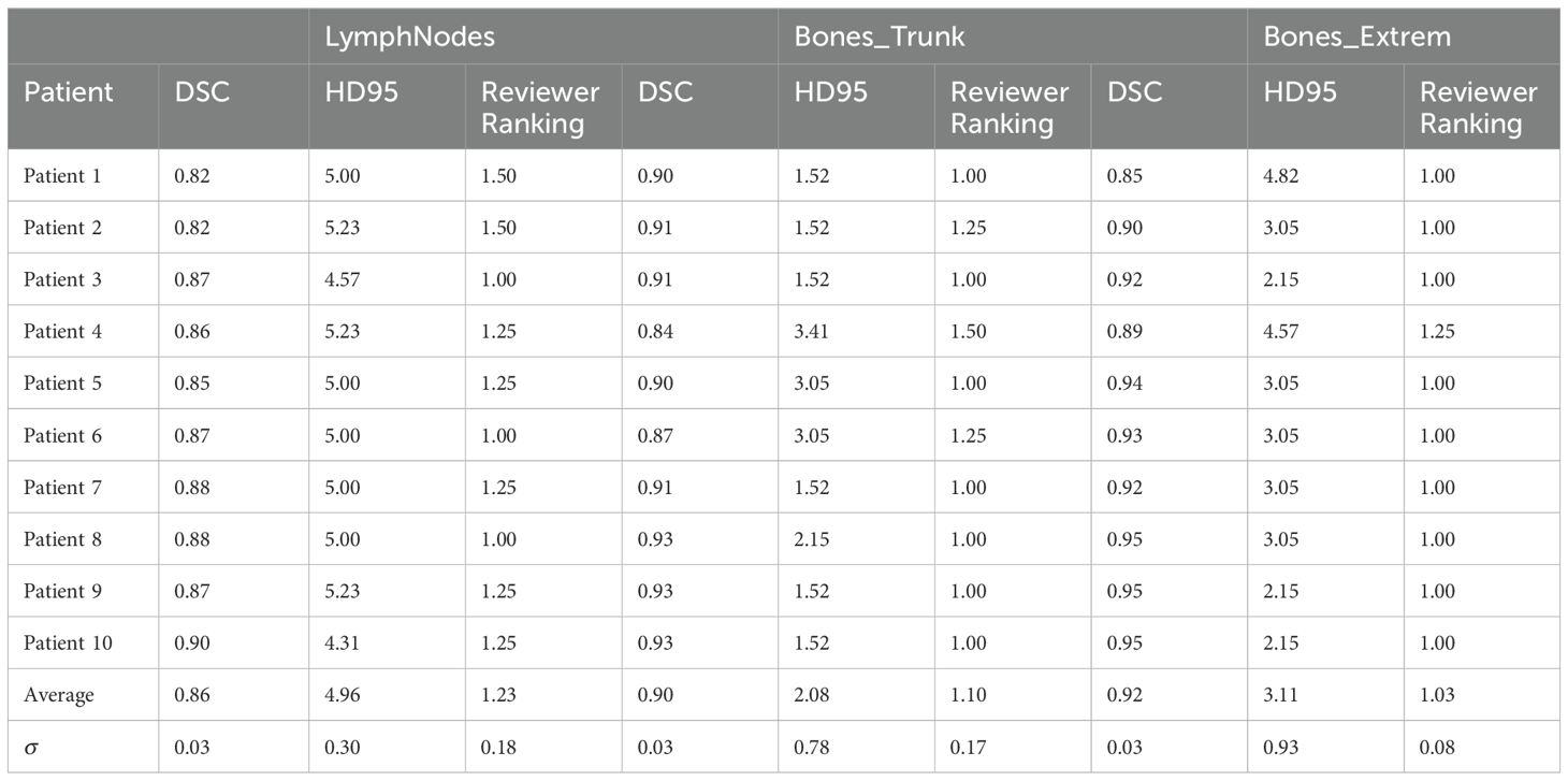 The auto-contouring model demonstrated high accuracy across TMLI target structures, with average DSC ranging from 0.86 to 0.92 and average HD95 of 3.38 mm. Reviewer scores consistently indicated minimal need for manual editing. The highest performance was observed in the extremity bones, likely due to their high contrast in CT images and relative anatomic consistency. These results align with previously published work on automated bone and lymph nodes segmentation (23, 24). Watkins et al. (23) developed an auto-segmentation approach using commercial auto-segmentation tool Medical Mind (Medical Mind, Inc., San Diego, CA) for TMI, targeting key planning volumes including: total bone with margin (PTV-Bone), lymph nodes with margin (PTV-Lymph Nodes), the chest wall encompassing ribs and mediastinum (PTV-Ribs), and the skull (PTV-Skull). Reported DSCs ranged from 0.81 to 0.95 across these structures, with HD95 values below 4.5 mm for most targets, except for PTV_Bone, which exhibited a substantially higher HD95 of 30.5 mm. A key distinction of our approach lies in training the AI model to contour clinical target volumes (CTVs) instead of PTVs with margins. This strategy leverages natural tissue-bone boundaries to improve segmentation accuracy and provides greater flexibility for applying institution-specific PTV expansions during planning.