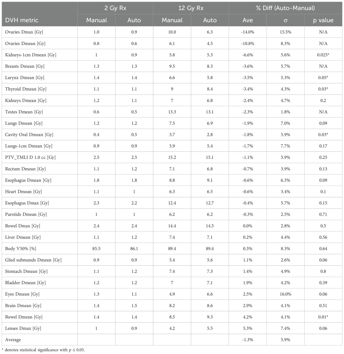 Table 2 shows the dosimetric comparison between auto-generated and manually created VMAT-TMLI plans for both 2 Gy and 12 Gy prescriptions. Overall, auto-plans demonstrated moderate improvements in plan quality to the manual plans, with an average OAR and target heterogeneity dose difference of –1.3% ± 5.9%. Statistically significant dose reductions in the auto-planned group were observed for Dmean of the kidneys-1cm (–6.6%, p = 0.025), larynx (–3.5%, p = 0.05), thyroid (–3.4%, p = 0.03), and oral cavity (–1.8%, p = 0.03). Bowel Dmean was greater in the auto-plans compared to the manual plans (+4.2%, p = 0.01). Difference in MU between auto- and manual plans was not significant (+7.4%, p = 0.08). Overall, for the same plan normalization of 90% PTV_TMLI covered by prescription dose, there was no statistically significant difference in plan inhomogeneity (PTV_TMLI D1cc), dose conformity (Body V50%), or MU between auto- and manual TMLI plans.