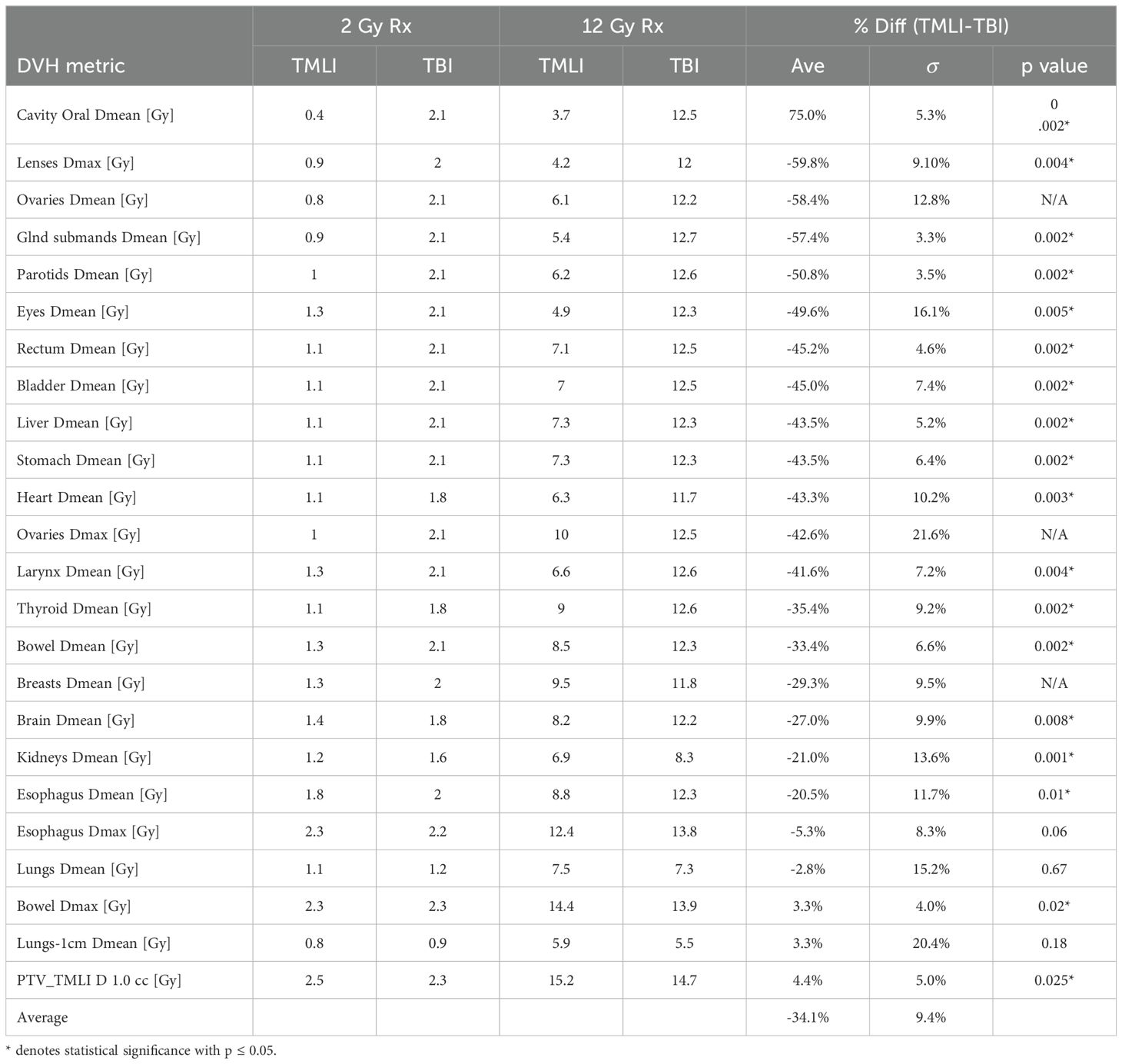 Table 3 shows the average achieved DVH metrics and differences in OAR sparing be- tween the auto-planned VMAT-TMLI and whole-body VMAT-TBI for 2 Gy and 12 Gy prescriptions. The auto-planned VMAT-TMLI plans achieved significantly greater OAR sparing compared to VMAT-TBI, with an average dose reduction of –34.1% ± 9.4%. Notably, the oral cavity, lenses, eyes, and salivary glands exhibited the most significant reductions, each exceeding 50% (all p ≤ 0.05). In contrast, maximum dose to the bowel and PTV TMLI D1.0cc were slightly higher in VMAT-TMLI plans with an average increase of 4.4%. Difference in MU between VMAT-TMLI and VMAT-TBI plans was statistically significant (+22.5%, p=0.0005). On average, due to the increased target complexity and the need for additional degrees of freedom, VMAT-TMLI plans utilized a greater number of beams (n=15) compared to VMAT-TBI plans n=13) (p = 0.0003), which would result in approximately two minutes longer delivery time.
