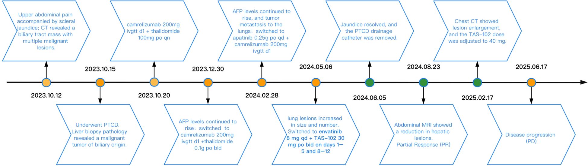 In this report, we first obtained the patient’s consent to publish her clinical data before reviewing this case study. This was an elderly female patient with advanced iCCA (with liver and lung metastases) who achieved partial response (PR) after receiving second-line treatment with lenvatinib in combination with TAS-102. At the most recent follow-up time, progression-free survival (PFS) lasted approximately 13.33 months. Figure 1 shows the patient’s diagnosis, treatment, and follow-up timeline.