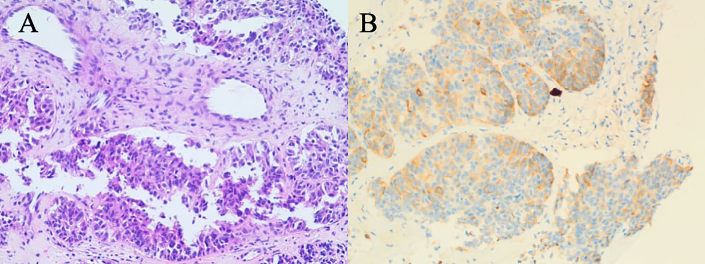 On October 12, 2023, a 66-year-old woman with no history of smoking, alcohol consumption, hepatitis B virus infection, or family history of malignancy presented to a local hospital with a 5-day history of epigastric pain accompanied by mild scleral icterus. Abdominal ultrasonography of the hepatobiliary-pancreatic-splenic system revealed obstructive jaundice, with the level of obstruction located at the hepatic hilum and a space-occupying lesion in the upper segment of the common bile duct. Contrast-enhanced abdominal CT further demonstrated a mass in the upper segment of the common bile duct with involvement of the hepatic hilum and right hepatic duct, as well as a malignant hepatic lesion highly suggestive of metastasis. On October 15, 2023, upon presentation to our hospital, the patient exhibited marked jaundice of the skin and sclera, with tenderness in the right upper quadrant. Laboratory tests revealed elevated serum alpha-fetoprotein (AFP) at 2,364.68 ng/mL (reference range: 0–8.1 ng/mL). Liver function tests showed a total bilirubin (TBIL) level of 278.33 μmol/L (reference range: 0–23 μmol/L), direct bilirubin (DBIL) of 244.73 μmol/L (reference range: 0–4 μmol/L), and indirect bilirubin (IBIL) of 33.60 μmol/L (reference range: 0–19 μmol/L). On October 16, 2023, the patient underwent percutaneous transhepatic cholangial drainage (PTCD) involving the right anterior lobe and the left lateral inferior lobe bile ducts, along with a liver biopsy. Histopathological examination of the biopsy specimen (Figure 2) revealed poorly differentiated carcinoma within the hepatic tissue. Immunohistochemical staining showed the following profile: CK20 (−), CK7 (−), CK19 (weak+), GPC-3 (+), Hepatocyte (−), CDX2 (−), P40 (−), CgA (focally weak+), Syn (focally weak+), CD56 (−), TTF-1 (−), GATA-3 (−), and Ki-67 (20%+). These findings favored a biliary origin, although a metastatic source could not be excluded.