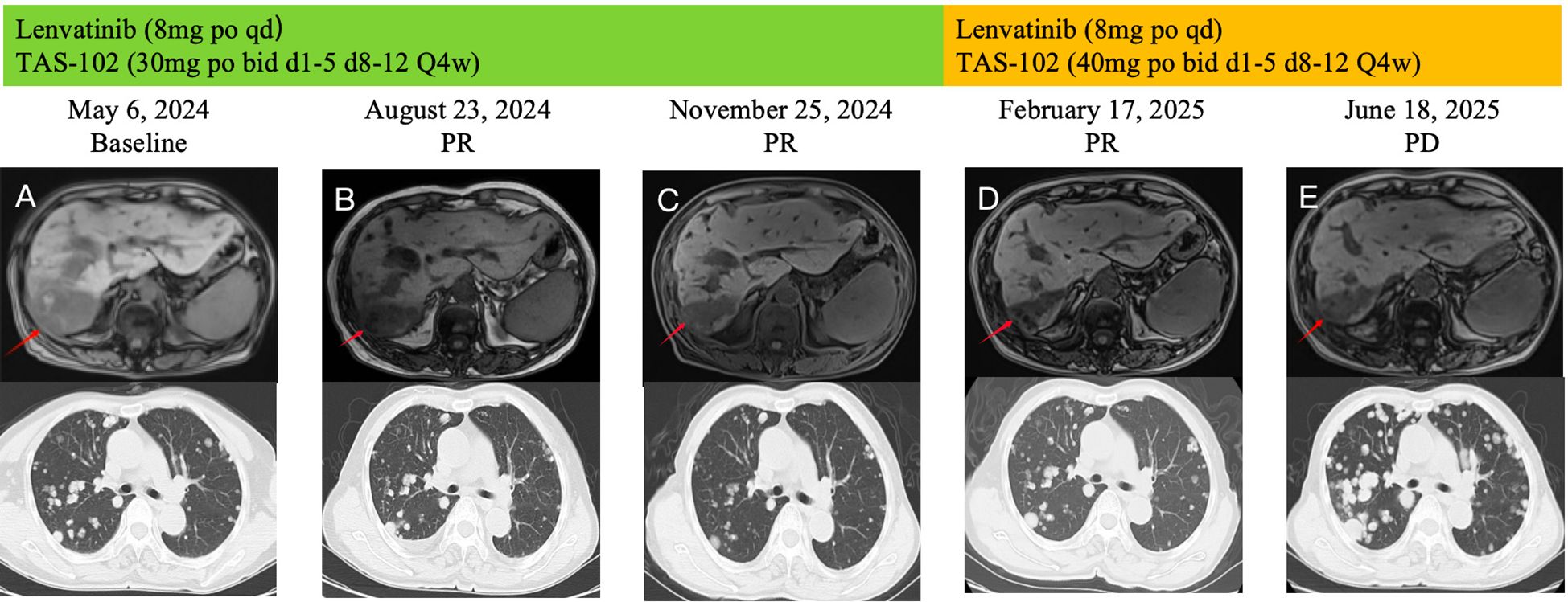 On May 6, 2024, the patient’s serum AFP continued to rise, reaching 11689.54 ng/mL. Abdominal MRI demonstrated enlargement of hepatic lesions, and chest CT revealed increased size and number of pulmonary lesions (Figure 3A). Treatment was initiated with lenvatinib 8mg orally once daily combined with trifluridine/tipiracil 30 mg orally twice daily on days 1-5 and 8-12 in 4-week cycles. After one cycle, the patient’s jaundice improved, total bilirubin returned to normal, and biliary drainage decreased. On June 5, 2024, the PTCD drainage catheter was removed at a local hospital. By August 23, 2024, serum AFP had decreased to 5258.58 ng/mL, and abdominal MRI demonstrated a significant reduction in hepatic lesions (Figure 3B). According to the Response Evaluation Criteria in Solid Tumors (RECIST 1.1) (13), the clinical response was assessed as a partial response (PR). The regimen was continued until November 25, 2024, when chest CT showed marked shrinkage of pulmonary metastases, with some lesions disappearing, and abdominal MRI revealed continued reduction of hepatic lesions (Figure 3C). Clinical response remained evaluable as PR. On February 17, 2025, the patient experienced chest tightness due to influenza. A chest CT scan at a local hospital showed enlarged lung lesions, while an abdominal MRI showed that the liver lesions were still shrinking (Figure 3). AFP levels rose to 4861.58 ng/ml. Considering that the patient’s recent weight gain had led to an increase in body surface area, the medication dosage was changed to lenvatinib 8mg po qd + trifluuridine tepiramycin 40mg po bid d1-5 d8-12 Q4w.Until June 18, 2025, the patient did not return for scheduled follow-up or dose adjustments. Chest CT at that time revealed marked enlargement and increased number of pulmonary lesions, while abdominal MRI showed slight enlargement of hepatic lesions (Figure 3E). Comprehensive assessment indicated disease progression (PD). Overall, the patient’s progression-free survival (PFS) was approximately 13.3 months. During treatment, the patient’s bilirubin levels dropped to the normal range, and even when the condition progressed, bilirubin levels did not rise. No treatment-related adverse reactions of grade 3 or higher occurred, and the ECOG score remained at 1-2 points. Overall, the treatment was well tolerated.