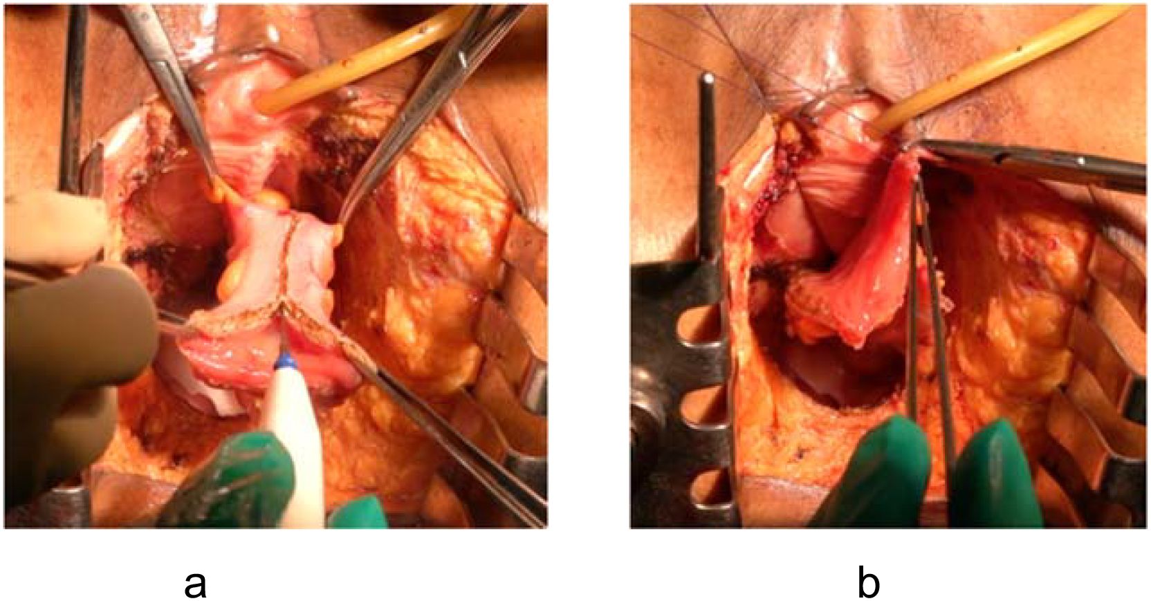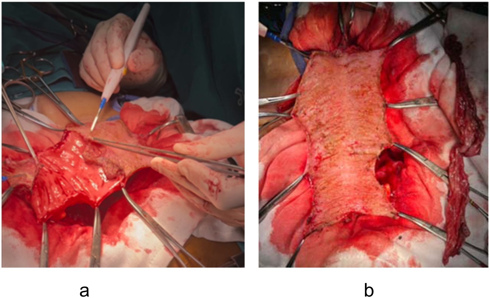 Figure 2. Mucosa-removed colonic flap for pelvic floor reconstruction. (a) Mucosectomy performed using electrocautery to remove the colonic mucosa. (b) Resulting seromuscular flap prepared for pelvic placement.
