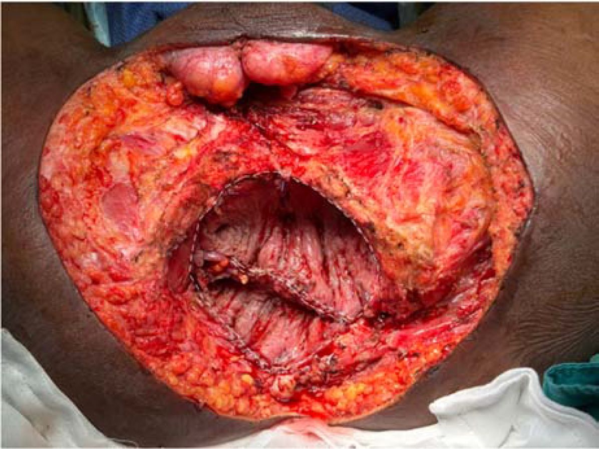 Scope of reconstruction: The colonic flap is designed for internal reconstruction of the pelvis and/or vagina. It does not provide a skin paddle and is therefore unsuitable for cases requiring large-scale external perineal skin closure. In such scenarios, the colonic flap is still the flap of choice to reconstruct the pelvic floor and a myocutaneous flap can be added on to address the large defect below the colonic flap. (Figure 6).