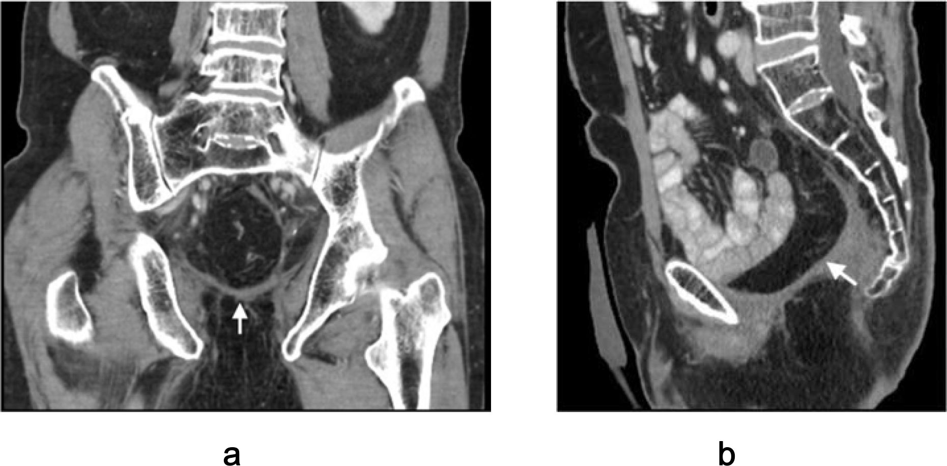 Figure 5. Postoperative CT imaging of mucosa-removed colonic flap. (a) Coronal view; (b) Sagittal view. Arrows indicate optimal alignment of the flap forming a neoperitoneal diaphragm, effectively preventing perineal herniation.